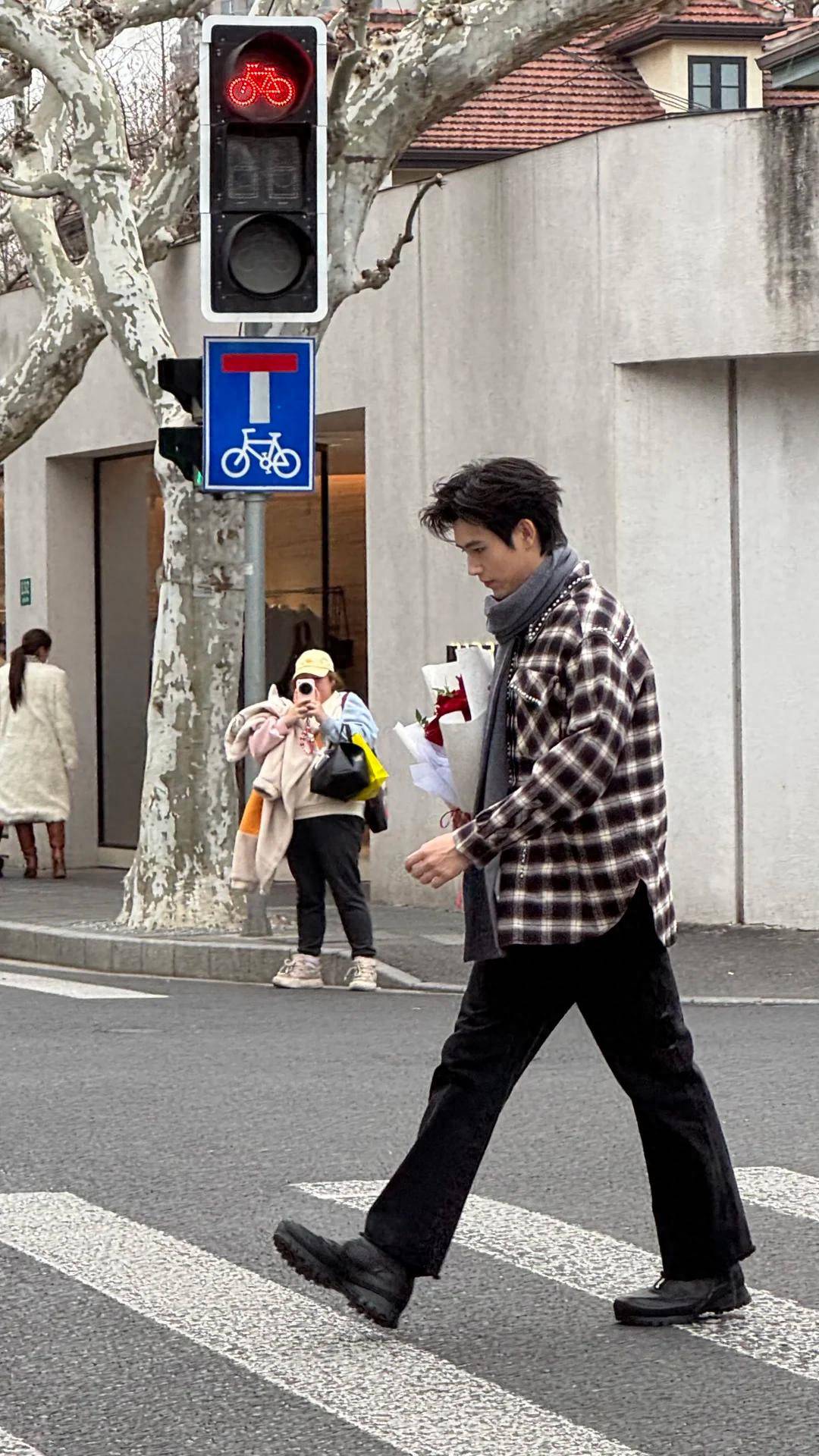 当天他走路背挺得笔直,步伐不快,偶尔会抬头看看周围的环境,神情温和又松弛,完全没有镜头前的拘谨,也没有一点明星的架子。
