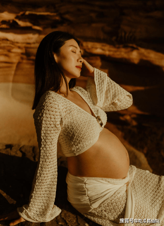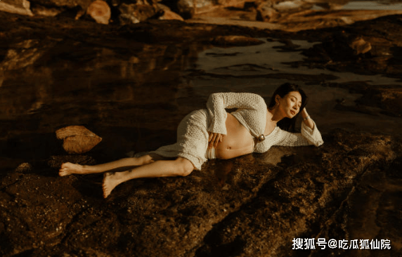 镜头里的她,时而坐在海边水中轻抚孕肚,嘴角微扬尽显温柔;时而一手撩发、一手托肚,低头浅笑或仰头灿笑,每一个角度都明媚动人;甚至还牵起裙摆,在海边轻盈“奔跑”,灵动又有活力,完全看不出是即将临盆的孕晚期妈妈[1]。即便坐在礁石上远景拍摄,也挡不住她的魅力与精致。