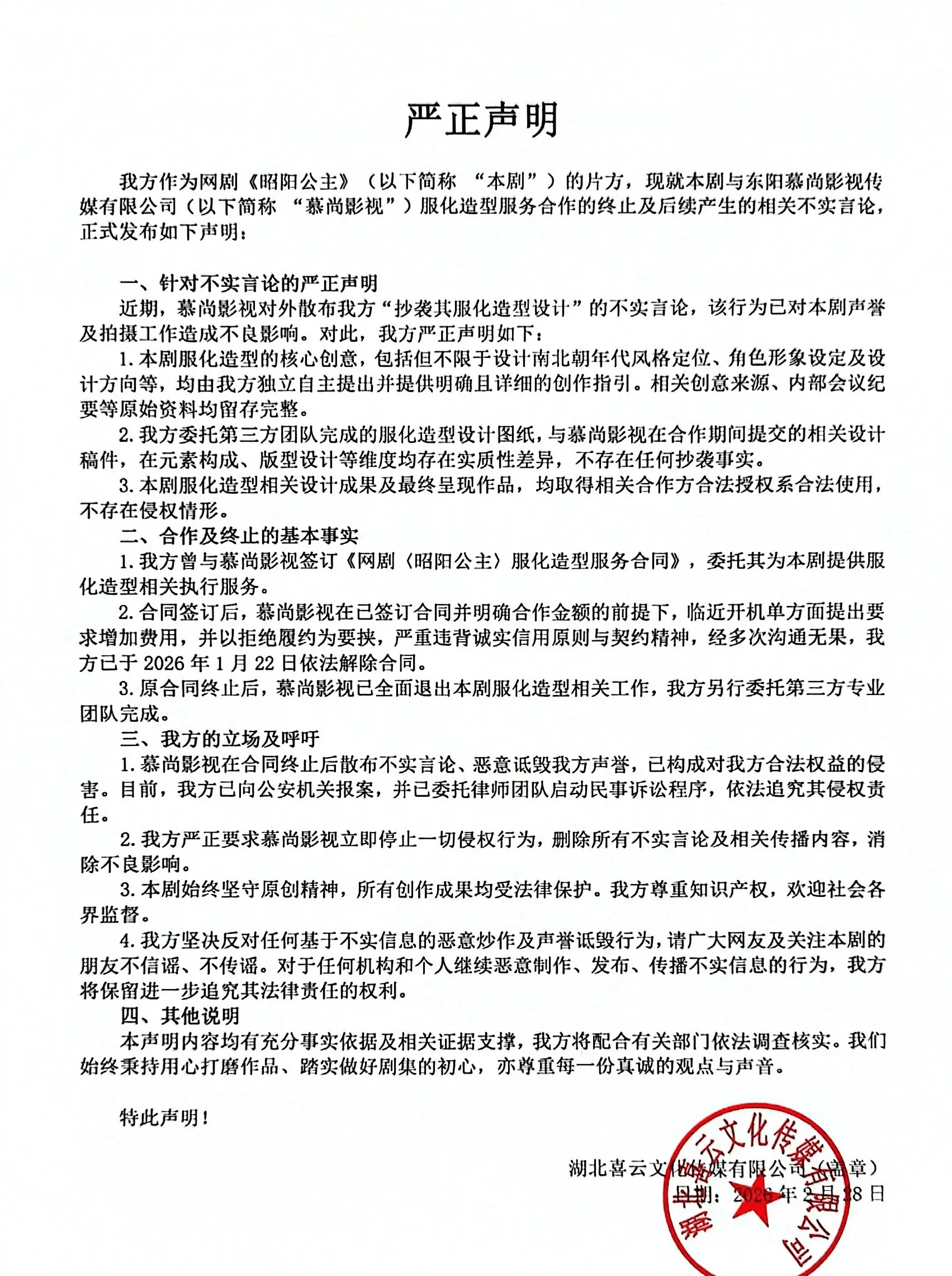 近日,有网友称《昭阳公主》服化道涉嫌抄袭,引发网络热议。之后,《昭阳公主》剧组发声明回应,称核心创意为独立提出,委托第三方团队完成的设计稿,与慕尚影视提交的稿件存在实质性差异,不存在抄袭。声明还称曾与慕尚影视签订《服化造型服务合同》,现已终止。