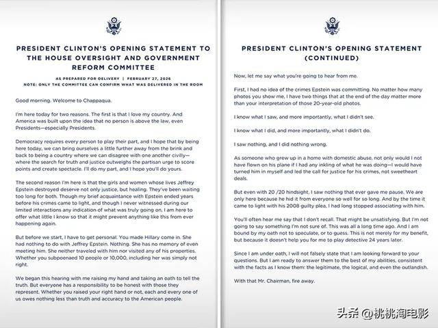 比尔·克林顿在众议院监督委员会作证时直言,自己对杰弗里·爱泼斯坦剥削、虐待以及性贩卖年轻女孩的骇人行径毫不知情。