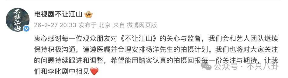 就在杨洋的微博发出三分钟后,剧组官博紧随其后进行了转发。