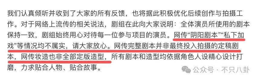 虽然剧组在声明中否认了所谓“阴阳剧本”,表示网传剧本是“未定稿资料”,但却也变相承认了部分“魔改”的真实性。