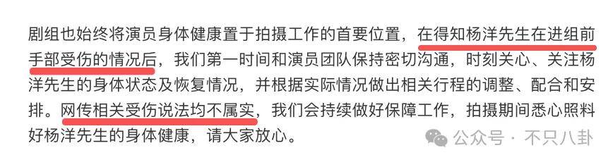 虽然澄清了杨洋是在进组前手就受伤了,但却并没有因此调整杨洋的通告单,依旧带着手伤拍摄打斗戏份。