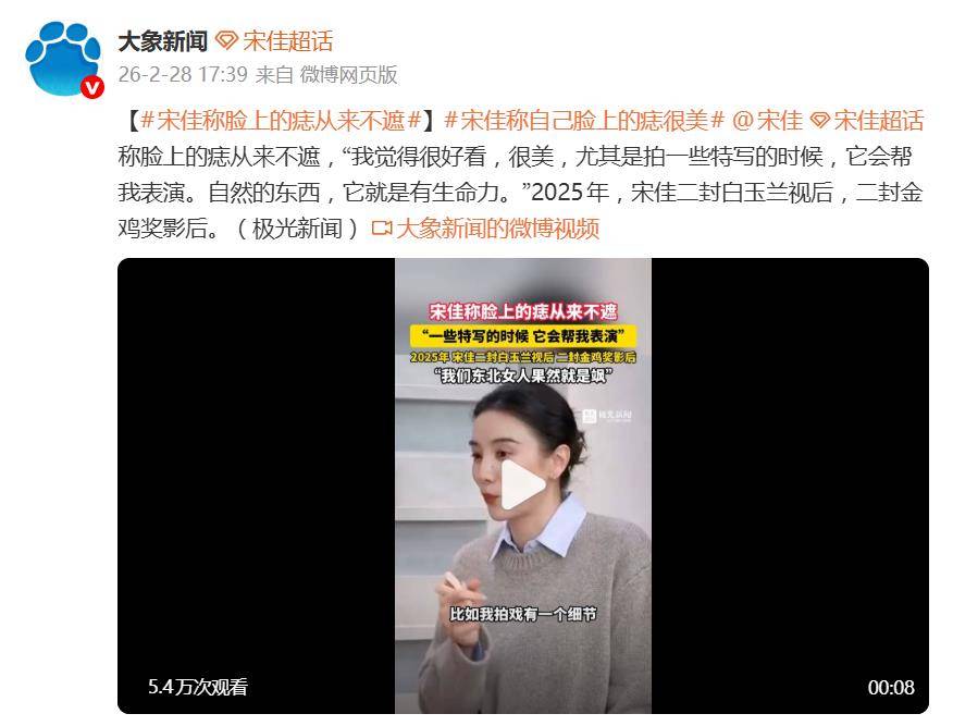 据2月28日报道,演员宋佳在采访中一句“脸上的痣从来不遮”,直接冲上了热搜。面对镜头,她坦然表示:“我觉得很好看,很美,尤其是拍一些特写的时候,它会帮我表演。自然的东西,它就是有生命力。”这番话,在追求“零瑕疵”滤镜的娱乐圈,堪称一股清流。