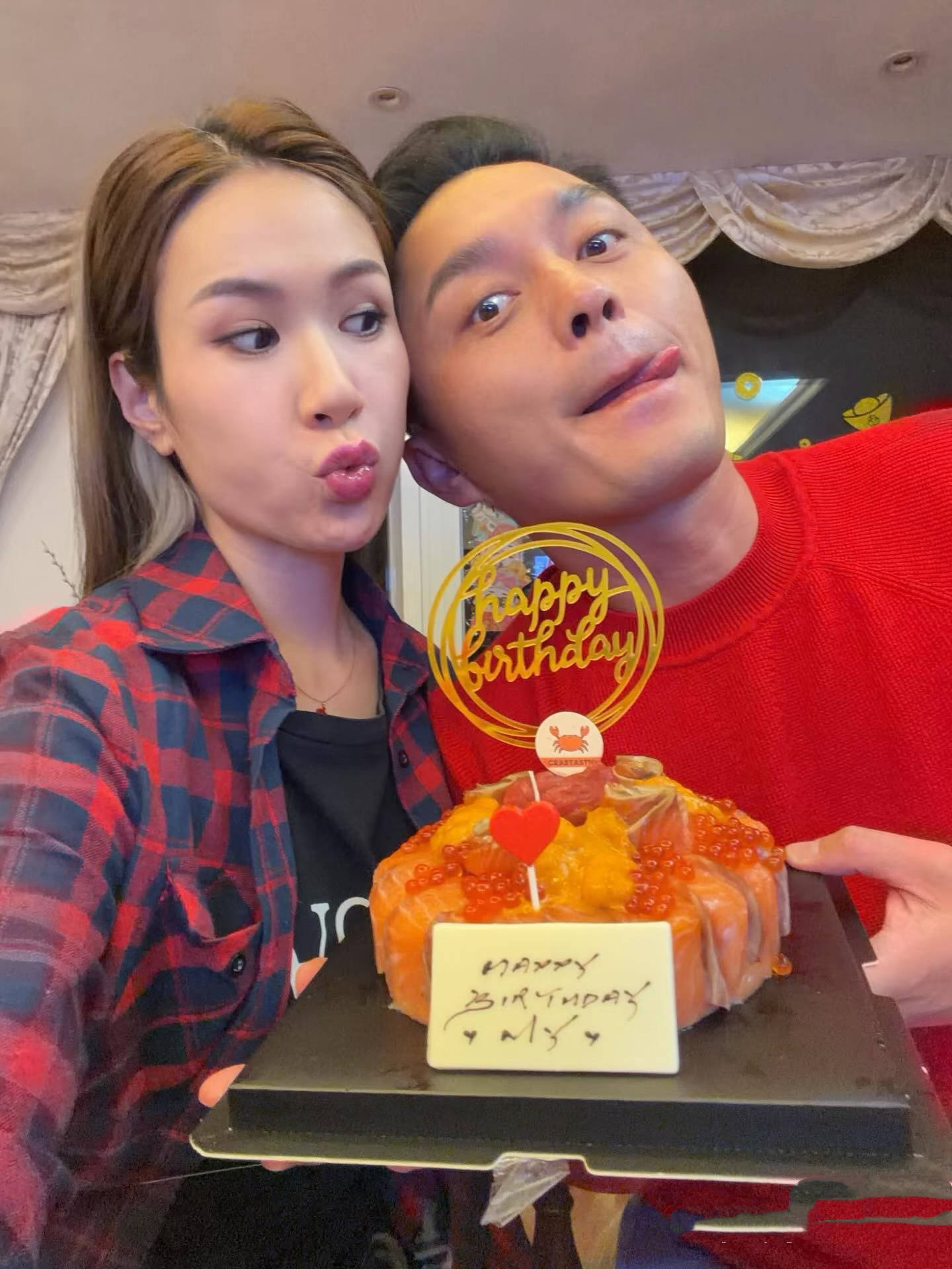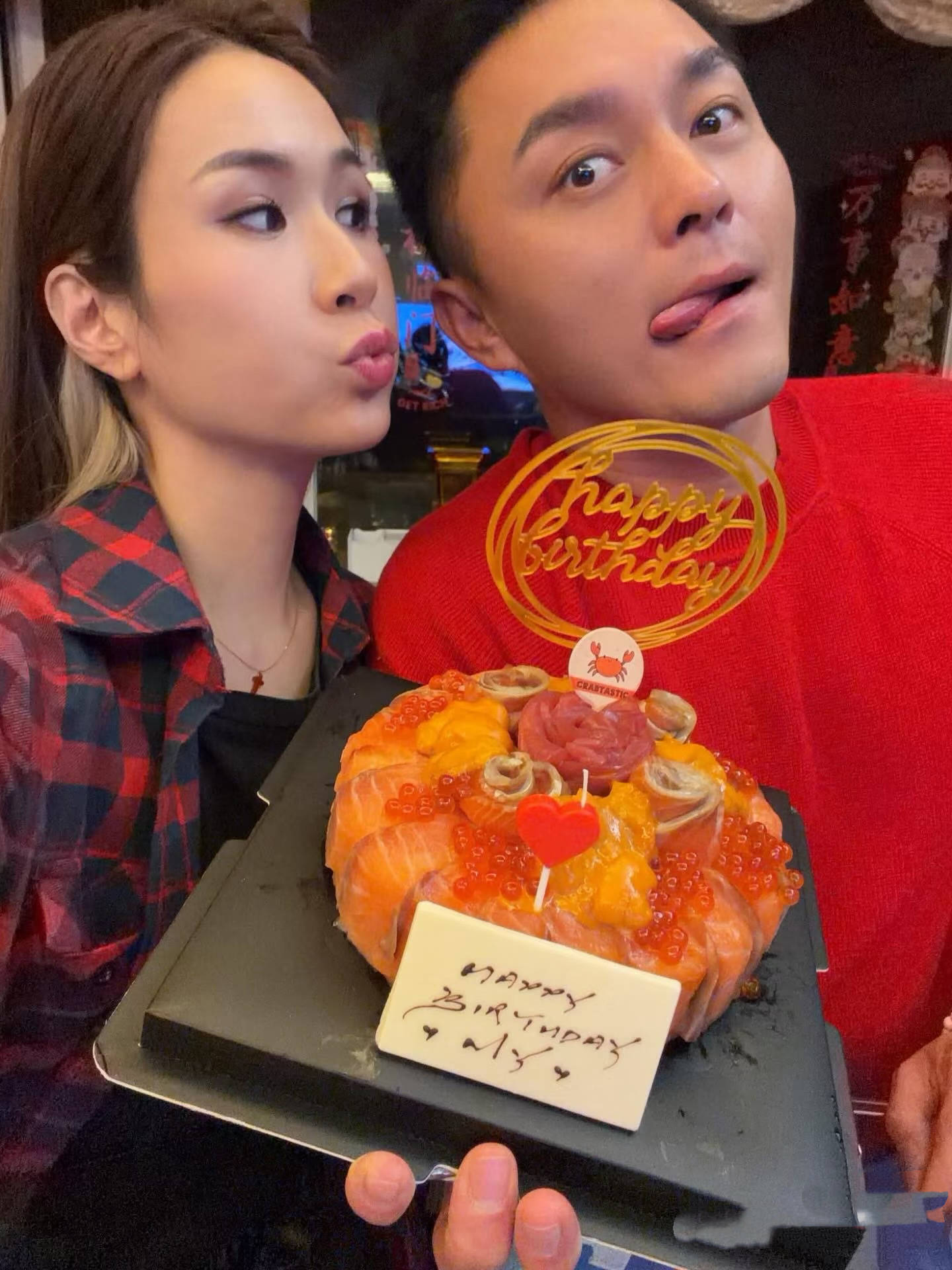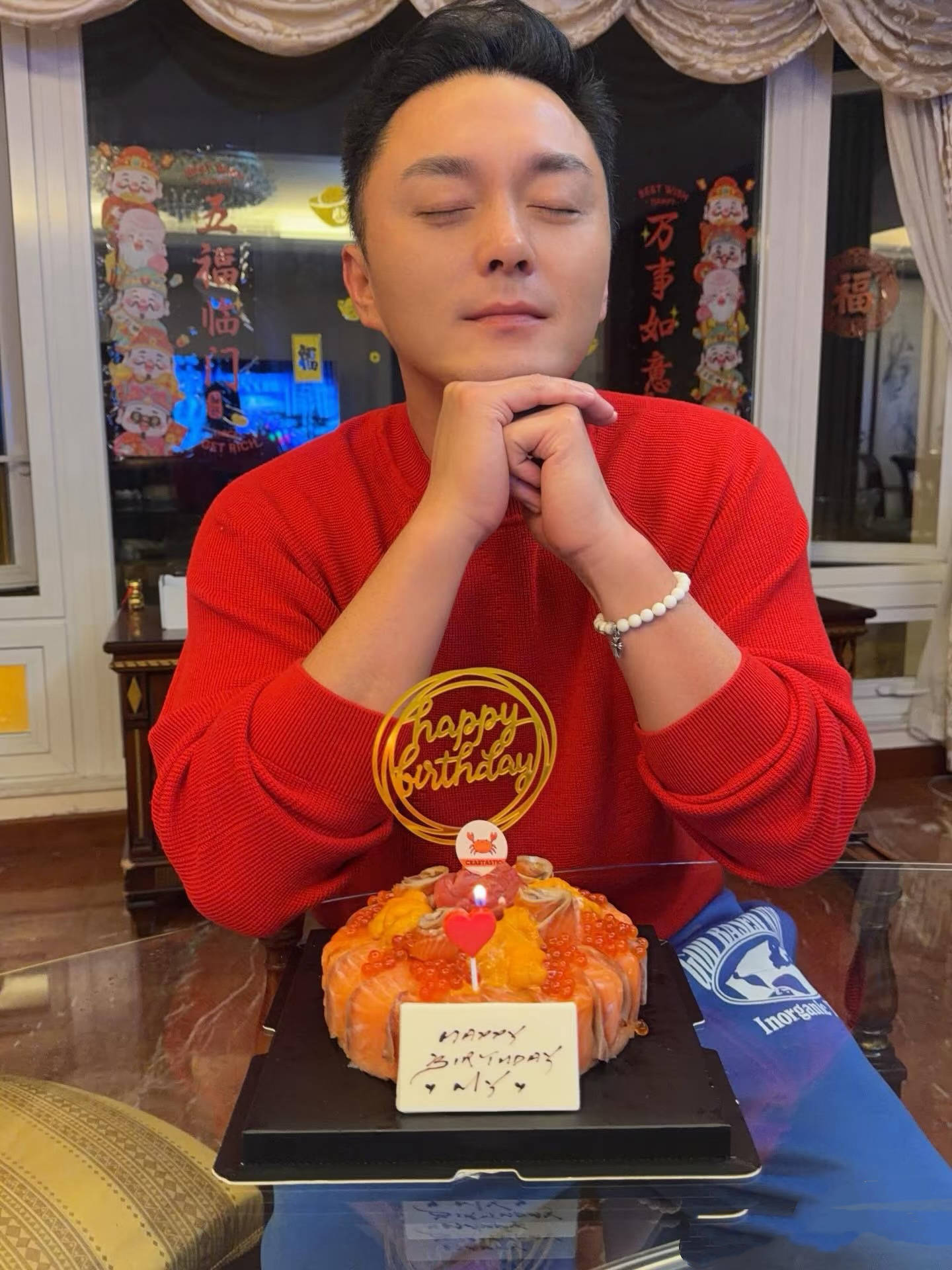 杨明穿一件红色卫衣、蓝色阔腿裤,看着以前都不老。而且他们准备的生日蛋糕也挺有意思,并不是普通奶油蛋糕,而是三文鱼刺身蛋糕。