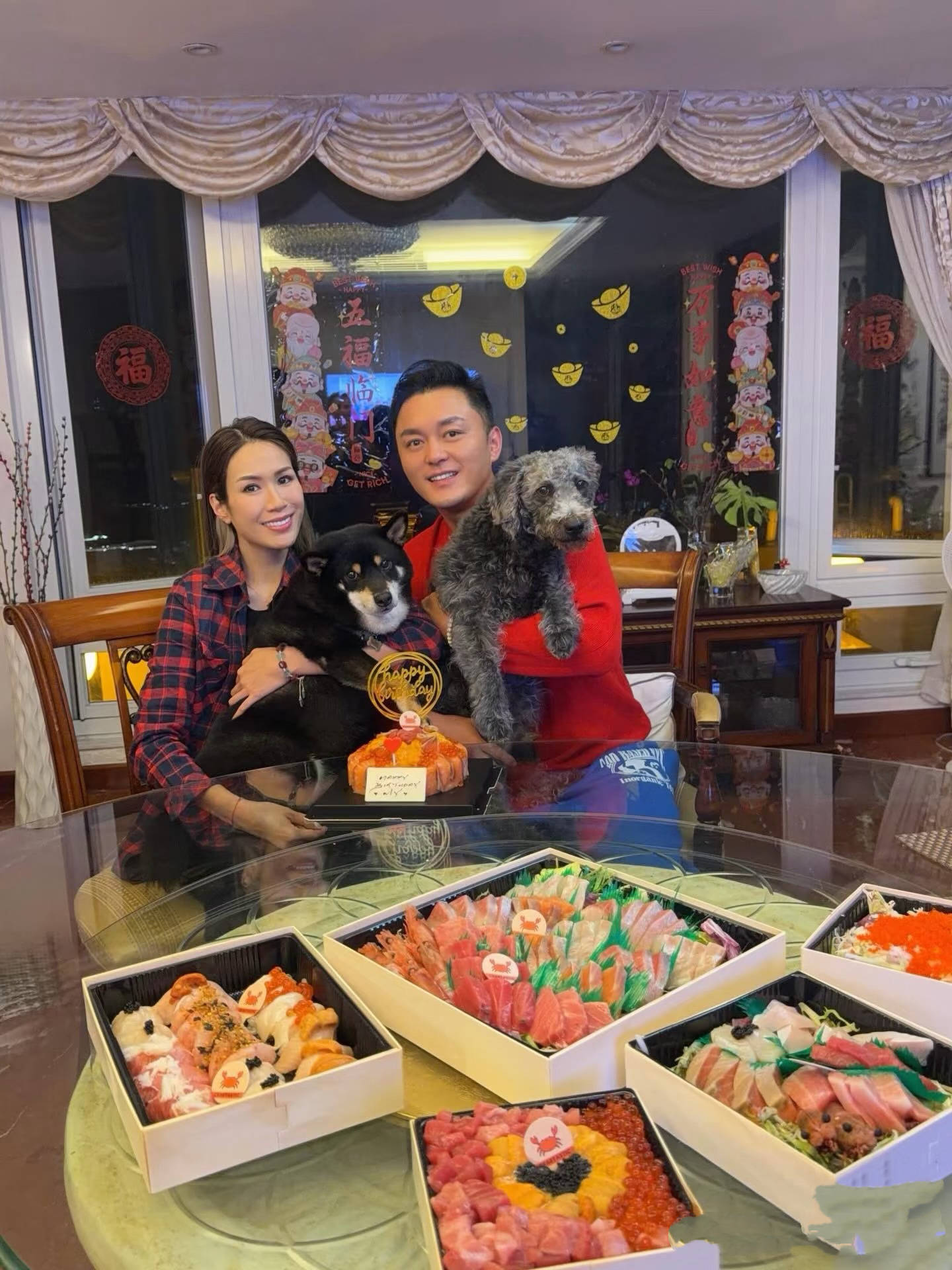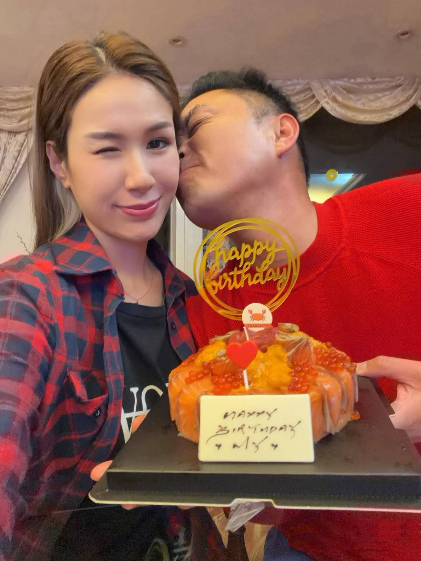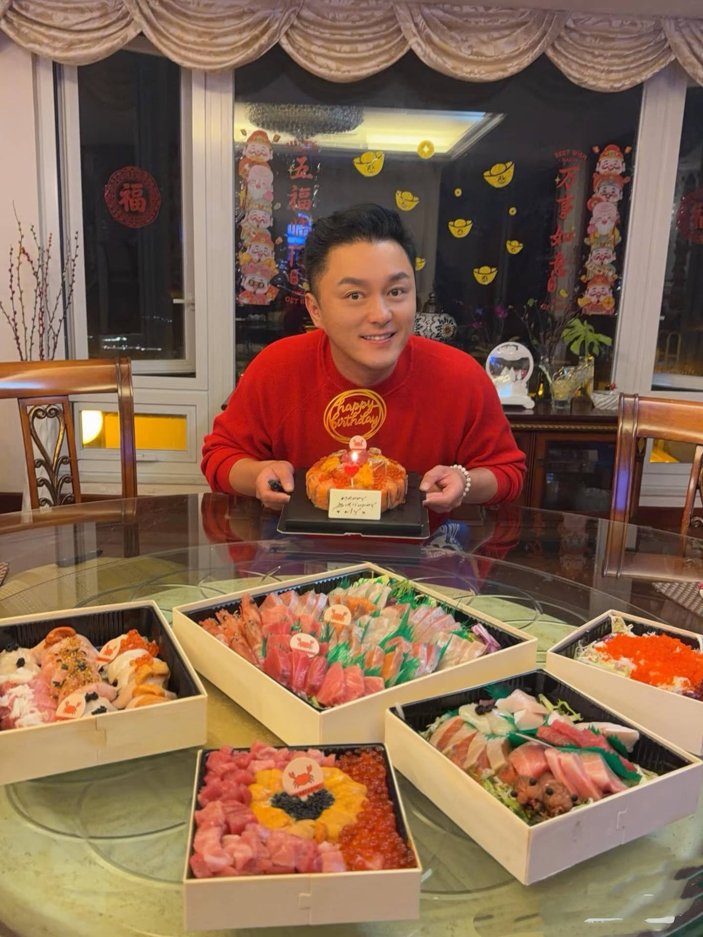 杨明穿一件红色卫衣、蓝色阔腿裤,看着以前都不老。而且他们准备的生日蛋糕也挺有意思,并不是普通奶油蛋糕,而是三文鱼刺身蛋糕。