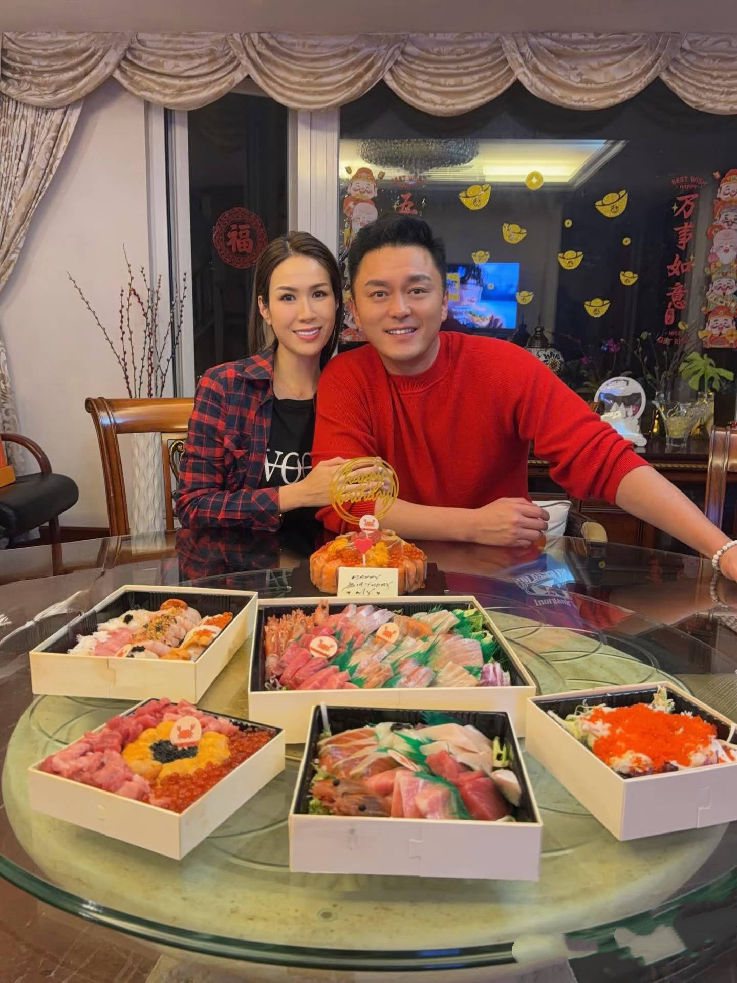 不知道两个人有多爱吃海鲜,过了生日摆了一桌子海鲜刺身。杨明还伸出舌头、做着搞怪的动作表情,一点都不像45岁。