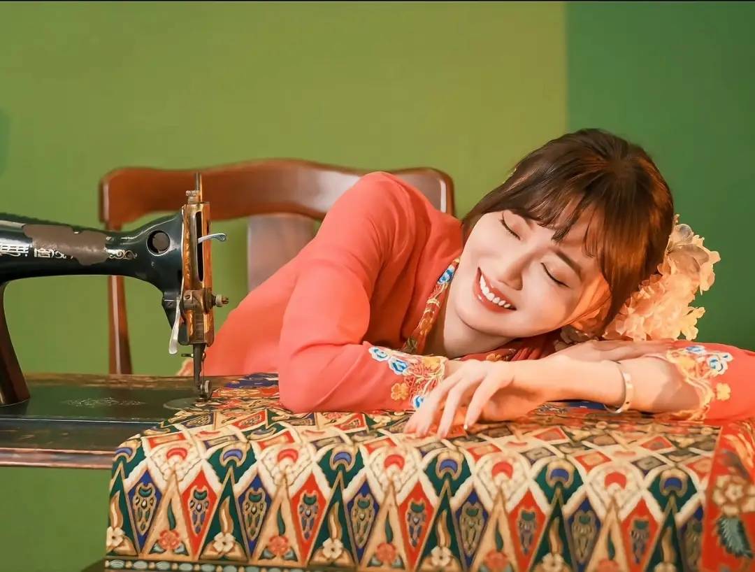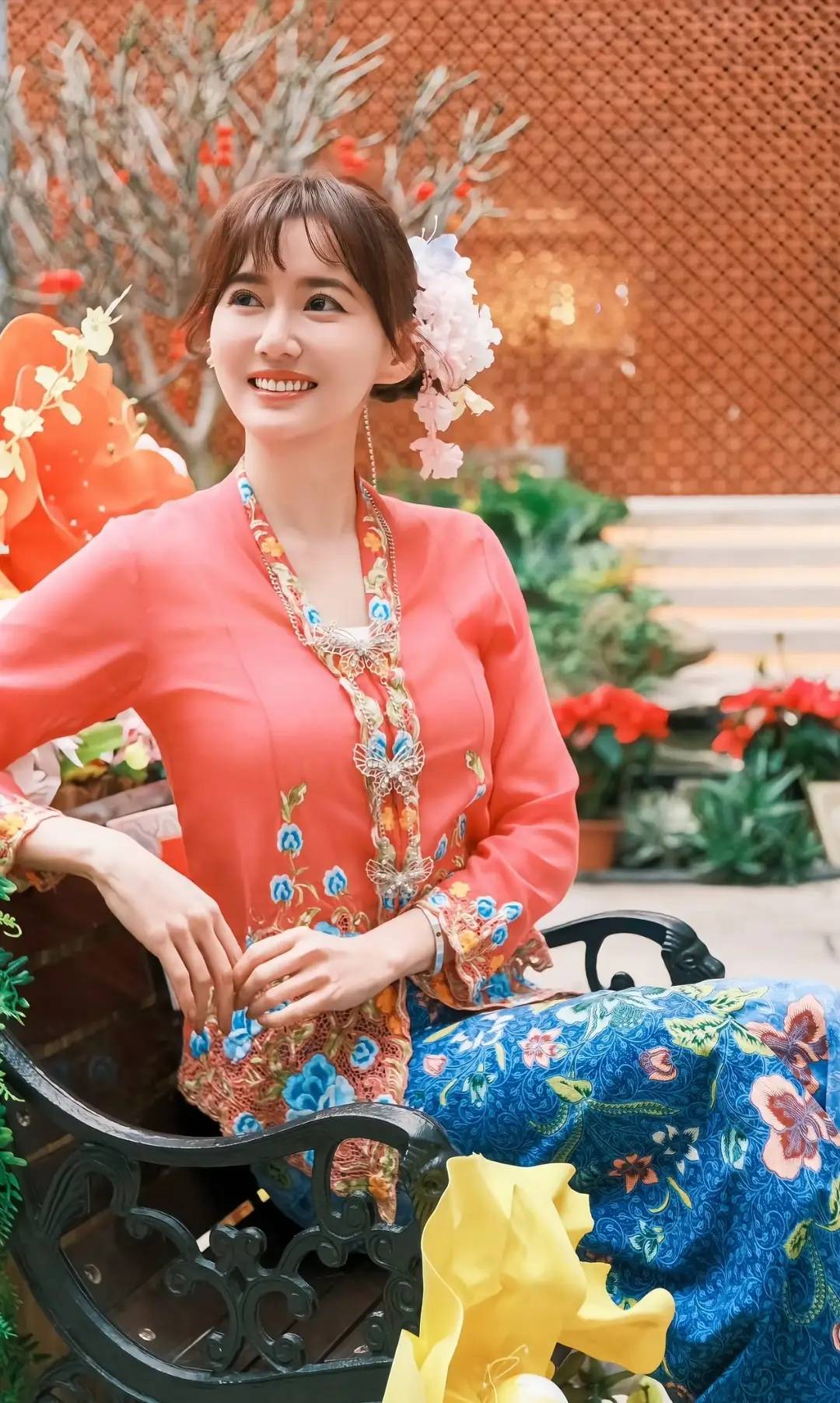 穿娘惹服饰,配上花簪头的发型,就更有异域风情。不过江铠同的花簪头不那么夸张,稍微一装点就显得更加唯美。