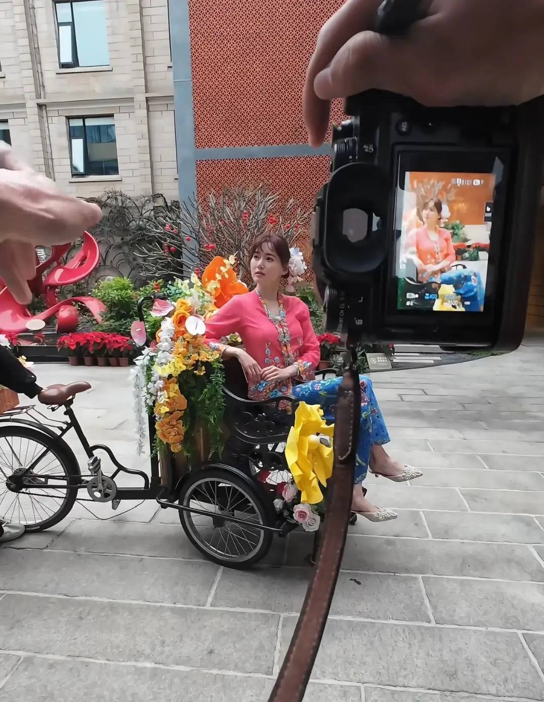 江铠同穿娘惹服在街边拍照,她坐在一辆花车上摆pose。为了拍出美美的照片,江铠同还特意配了花簪头的造型。