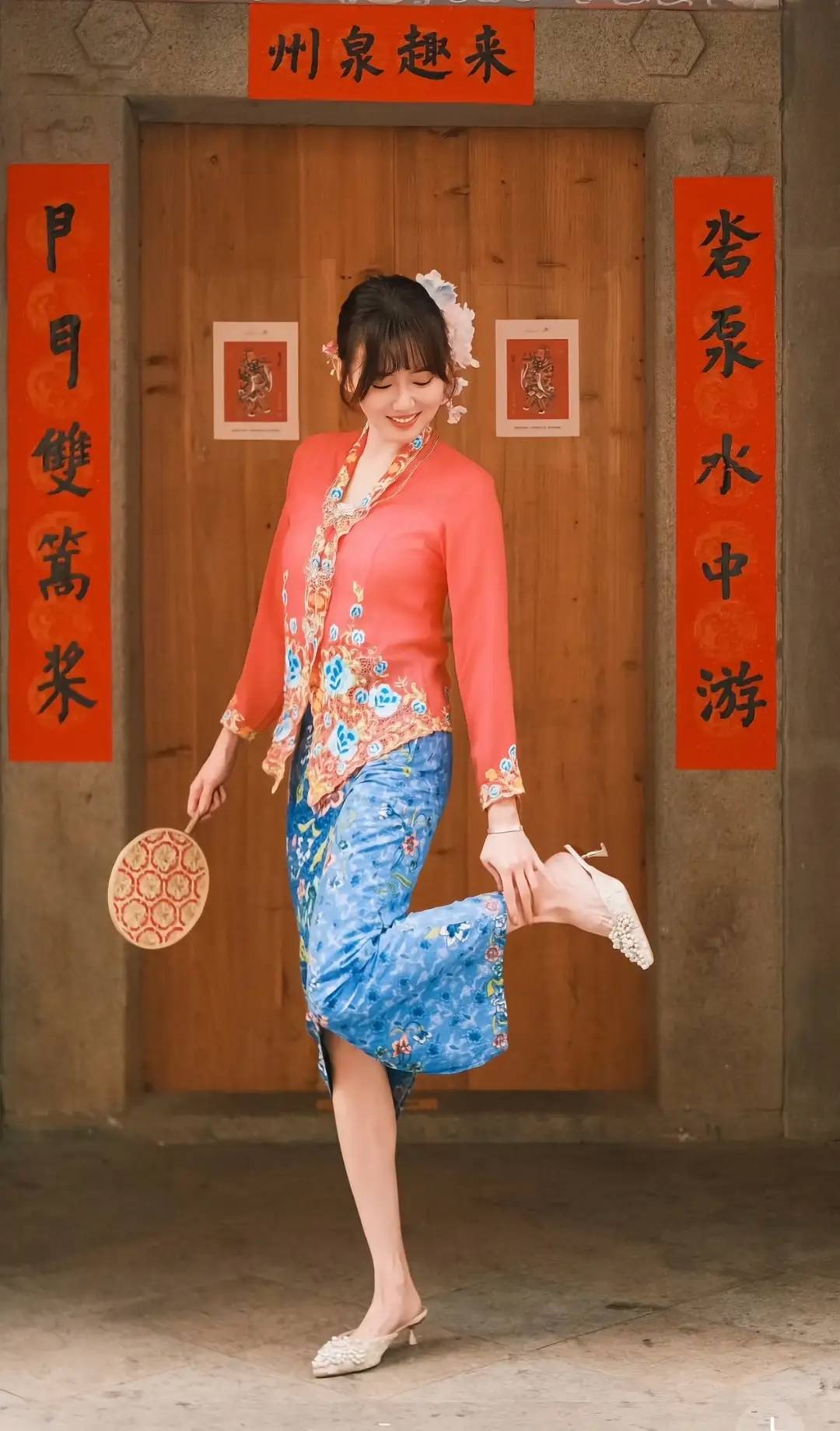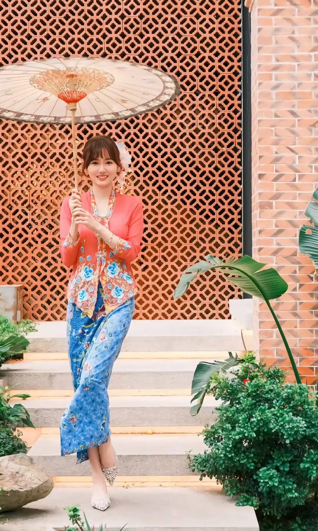 穿着修身的娘惹服饰,搭配蓝色系半身裙,这红蓝配色格外明媚醒目。江铠同撑一把好看的纸伞,就像是从画中走来一般。