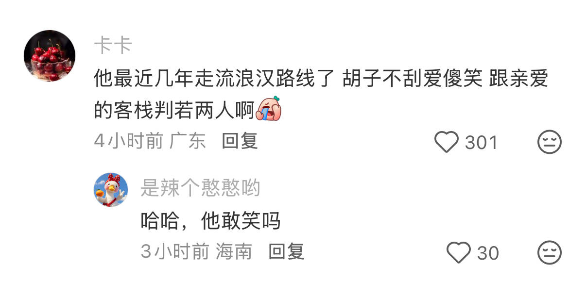 也有网友说这几年他走的就是“流浪汉”路线,胡子不刮、爱傻笑,和在《亲爱的客栈》里面简直判若两人。