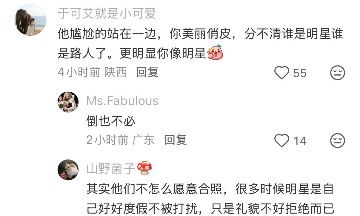 其实很多明星在被偶遇的时候并不愿意合照,也只是想好好度假不被打扰,而出于礼貌又不是很好拒绝,所以总是一副蔫蔫的、不情不愿的感觉。