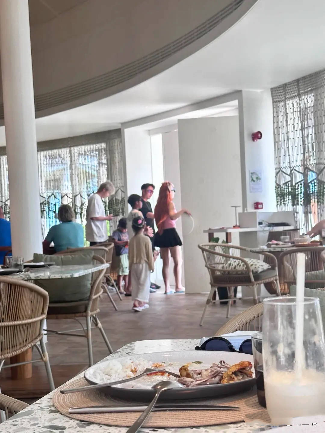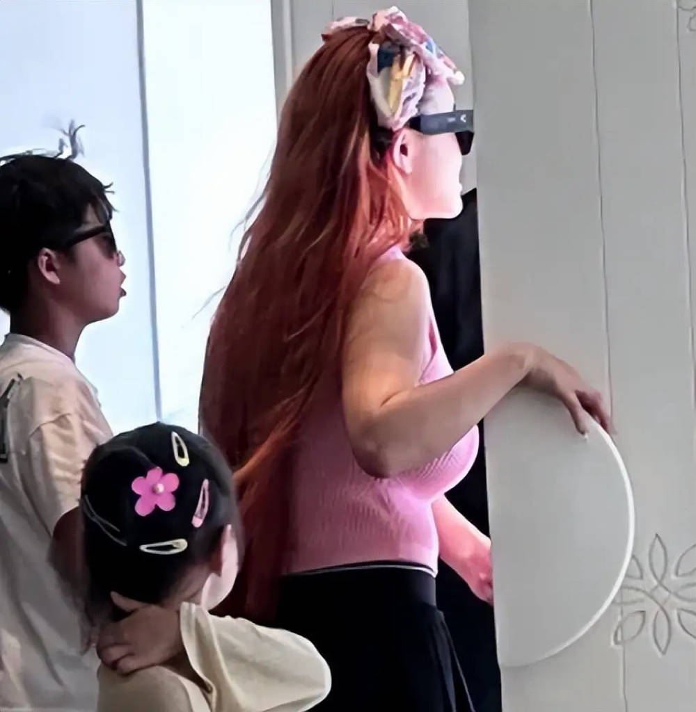 网友还拍到了一家人离开时候的画面,冉莹颖也换了新造型,挑染了一头红色头发,远远的坎像个精神小妹。