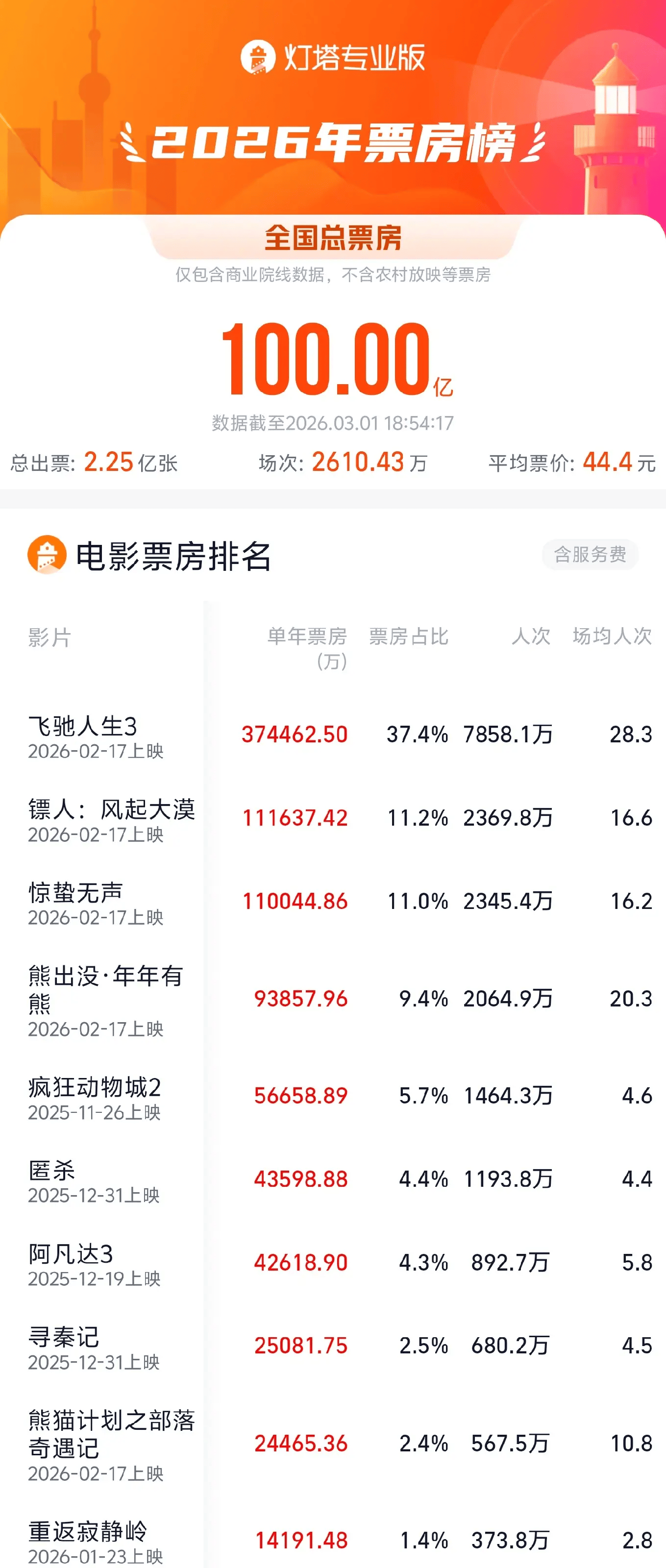 据灯塔专业版数据,截至3月1日18时54分,2026年度大盘票房(含预售)突破100亿,《飞驰人生3》《镖人:风起大漠》《惊蛰无声》暂列年度票房前三。