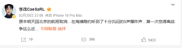 李茂在视频中提及,身处朱美拉海滩时听到5次沉闷爆炸声,并目睹机场、帆船酒店等地受导弹拦截残骸波及出现火情,坦言"第一次离战争这么近"。