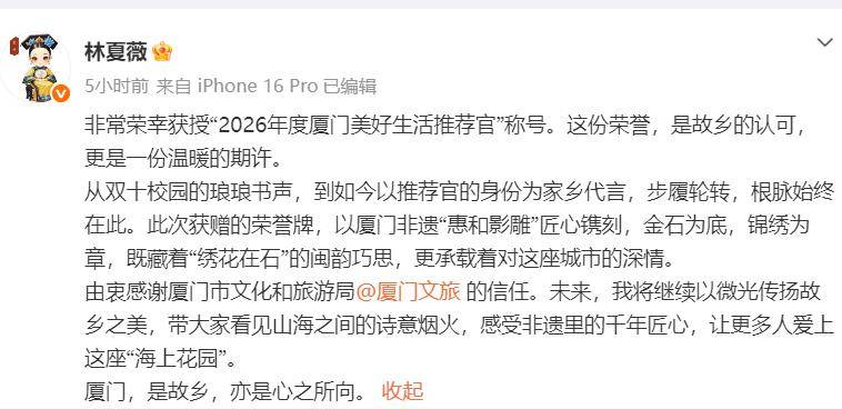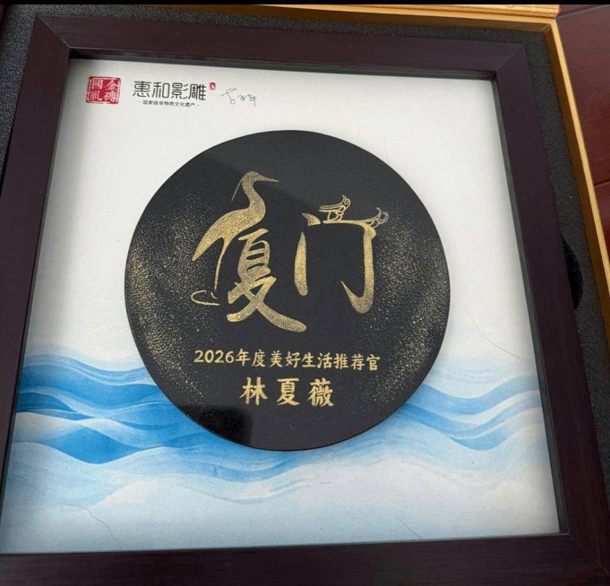 日前,林夏薇衣锦还乡,获厦门市文旅部门授予“厦门2026年度美好生活推荐官”荣誉,荣升厦门旅游大使!