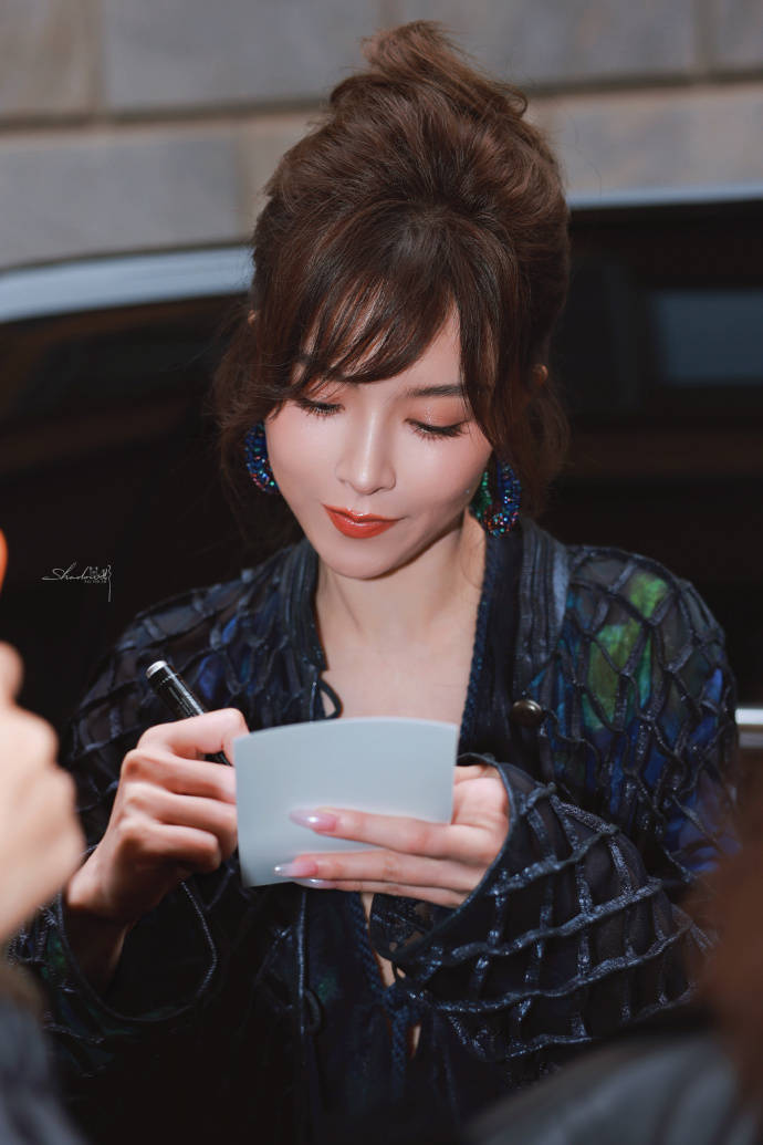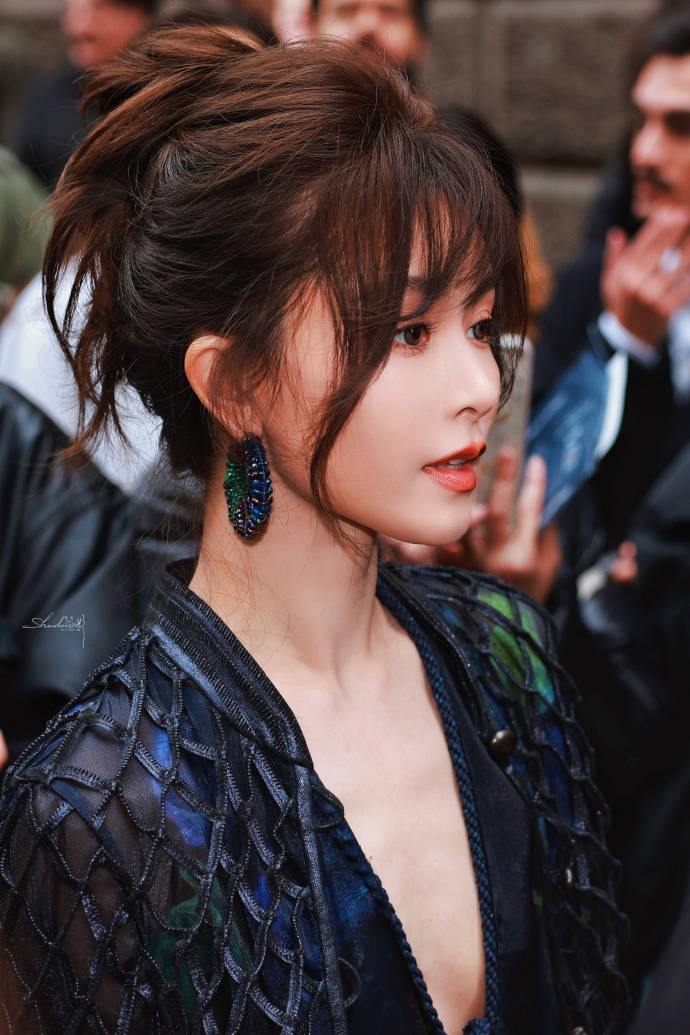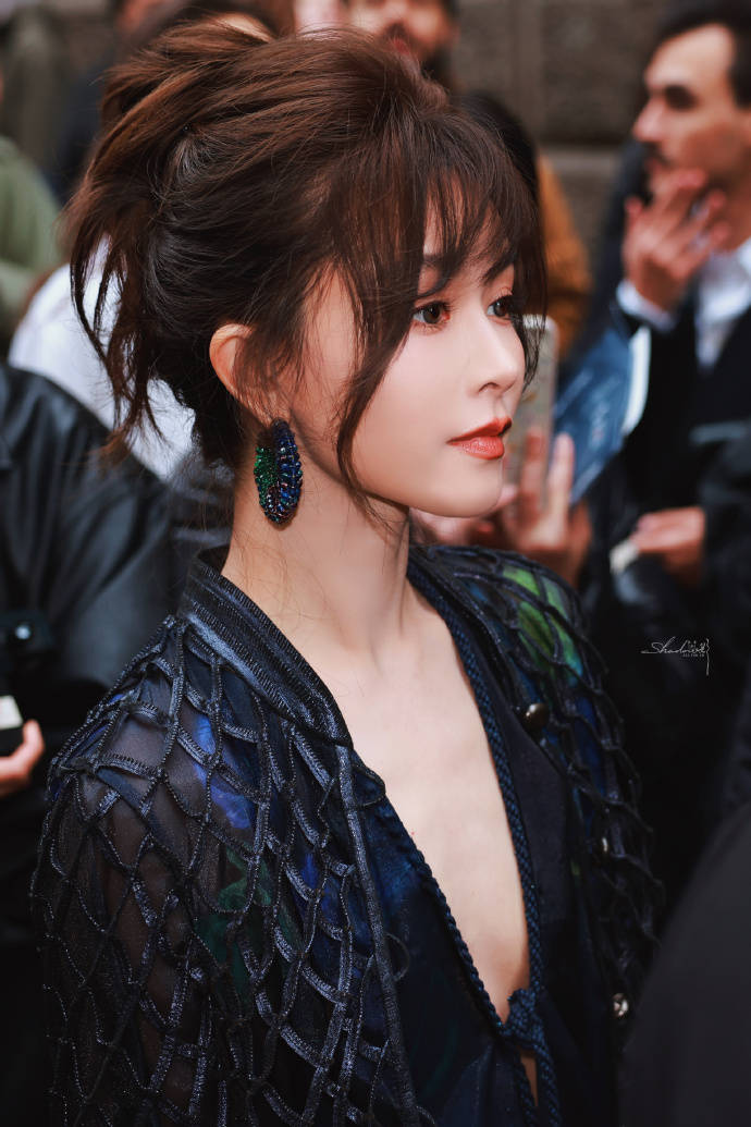 文咏珊身穿一袭黑色深V衣裙,她俏脸冷艳,化着烟熏妆,干练高丸子头,领口从锁骨延伸至腰部以下,流畅勾勒肩颈至腰臀曲线;外搭菱形网格手工外套,增强了冷艳感。