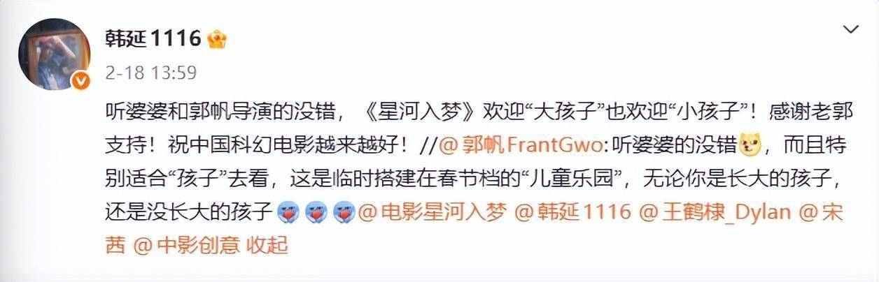 是的,讲义气的郭帆,为韩延和《星河入梦》打call了,但只给了这一条,他更多的是为好兄弟吴京的《镖人》打call。