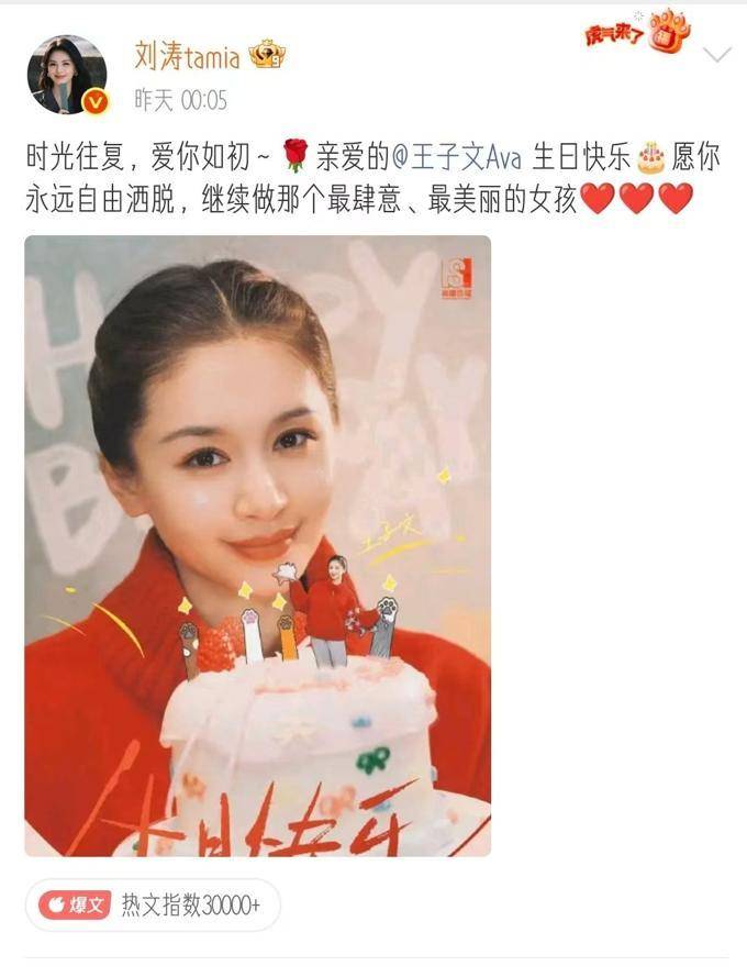她在为剧宣做预热的同时,也没有忘记给王子文送上生日的祝福,尽管她没有单独在微博上发布,但这至少是出于心意。