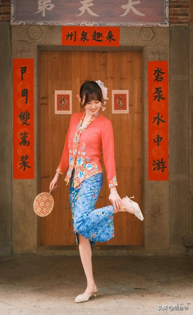 照片中,江铠同在泉州度假,穿着一套“小娘惹”的服饰在街头拍照。