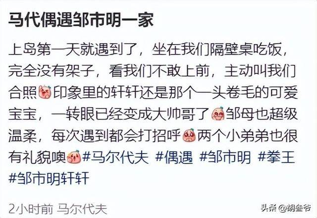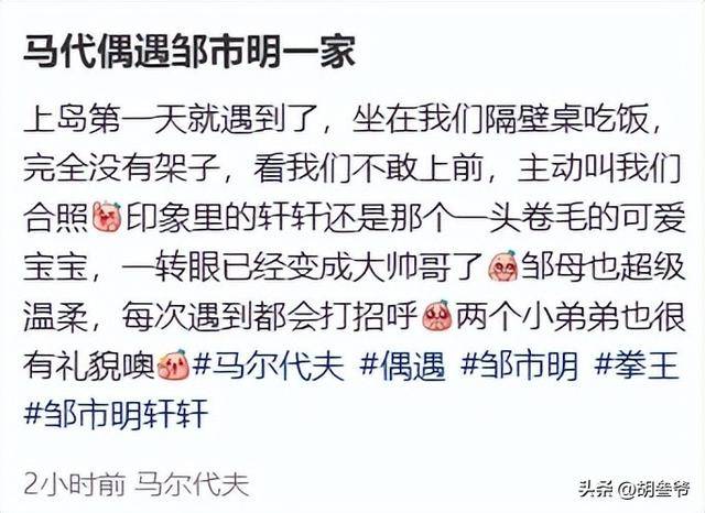 有网友在马尔代夫偶遇这一家五口度假,拳王邹市明还笑着和路人合影。