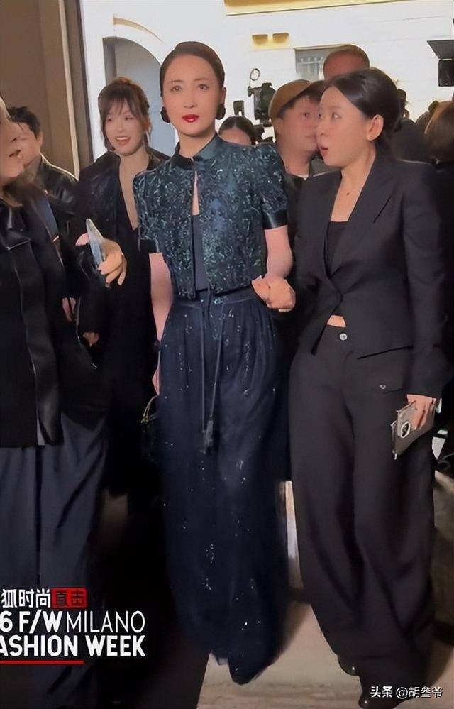 有网友发现她在秀场拍照时,双手紧紧抓着助理的胳膊,看起来明显有些紧张,生怕不小心摔倒。