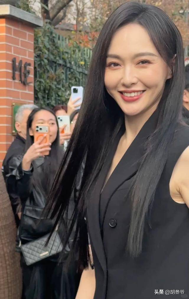 42岁的状态怼脸拍都没死角,黑长直搭配无袖西装裙,意式极简和东方温婉揉在一起,直接成了本届时装周的优雅代名词。