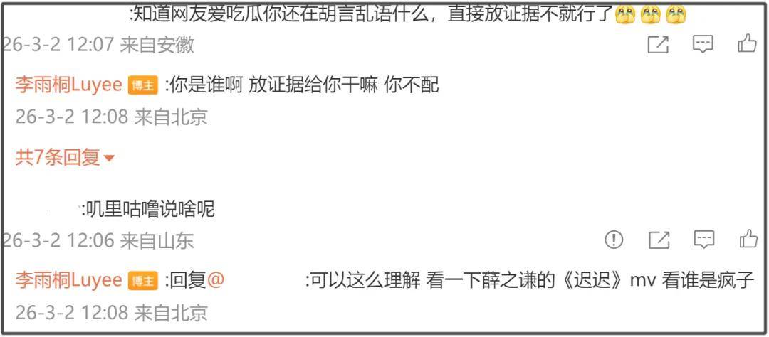 胡乱吐槽了一番后,李雨桐分享自己的社媒账号,让大家不要找错人了,不要分不清李一桐和李雨桐。而这之前,她还声称自己手里有王一博、Bigbang等明星的签名照博关注,被质疑炒作热度。