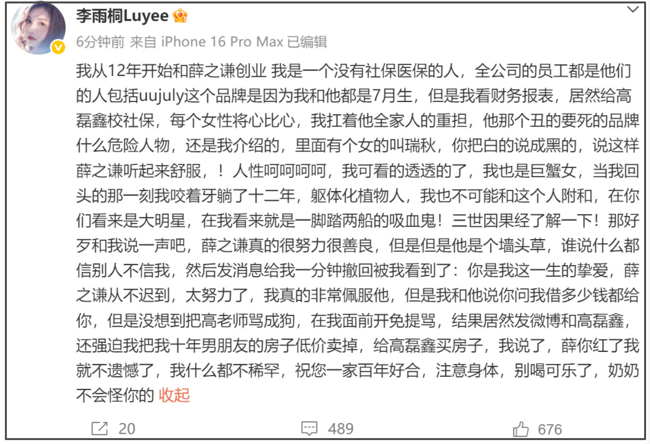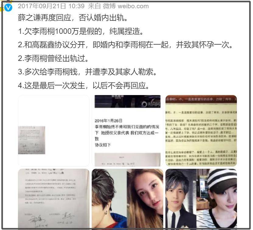 9年前,李雨桐条理清晰的手撕薛之谦出轨,诞生了“雷神之锤”热梗。之后,薛之谦否认婚内出轨以及欠款,指责对方说谎。当时,薛之谦发了律师函告李雨桐,后来又撤诉了,并未对外公布撤诉理由,而薛之谦的歌手事业也没有受到任何影响。如今,李雨桐跳出来提薛之谦两口子仙人跳,可能也是对薛之谦和高磊鑫把她坑害了,所以意难平。