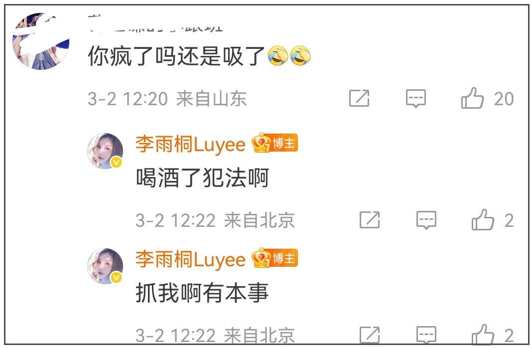 看到李雨桐不晒证据只顾自己高兴,不少吃瓜网友的耐心耗尽,让她没事儿上个班。她则表示自己的微博想咋发咋发,一会儿是自己有最有钱的男朋友,一会儿是男朋友给自己打工,自己是董事长,整个就是逻辑混乱。也因此被质疑喝醉了,她怒怼“喝酒犯法啊”,随后删除了所有内容。