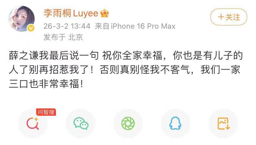 李雨桐在2026年3月2日再次公开喊话薛之谦,核心原因很可能是积压多年的情感创伤与公众形象被长期扭曲的愤怒集中爆发,叠加对薛之谦与高磊鑫复合后“幸福人设”的强