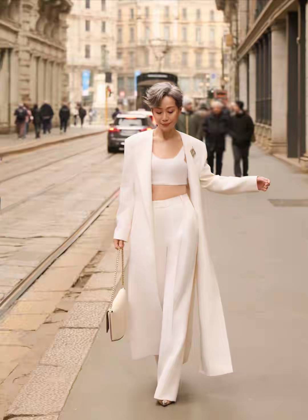 而在前几天,63岁的叶童一身纯白色造型亮相米兰的街头,没有可以烫染的银发,也没有可以的浓妆艳抹,就是展现63岁的身材和面容,