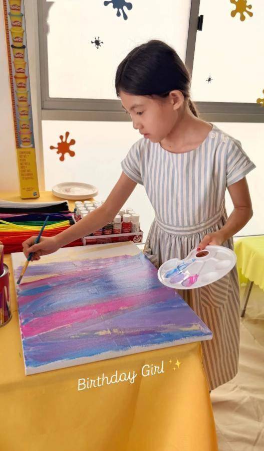 Alaia生日这天,Alaia姑姑还分享了一张她画画的照片。Alaia扎着马尾,穿着一件条纹连衣裙,手臂修长,侧脸长得简直和妈妈一模一样,完全就是小版的秦舒培,就连气质都和妈妈很像。