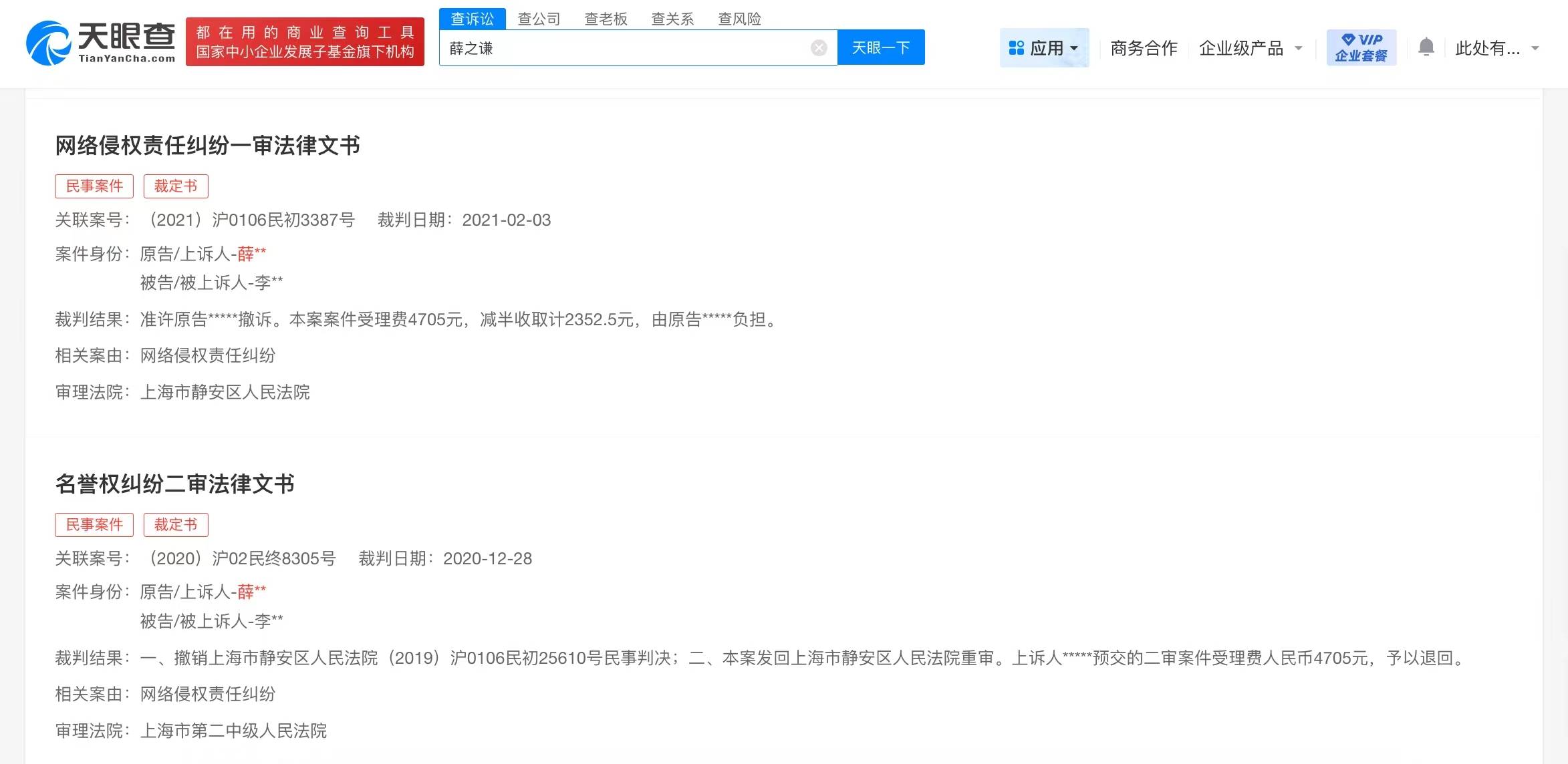 天眼风险信息显示,薛之谦曾多次起诉李雨桐侵权,案由包括名誉权纠纷、合同纠纷等。