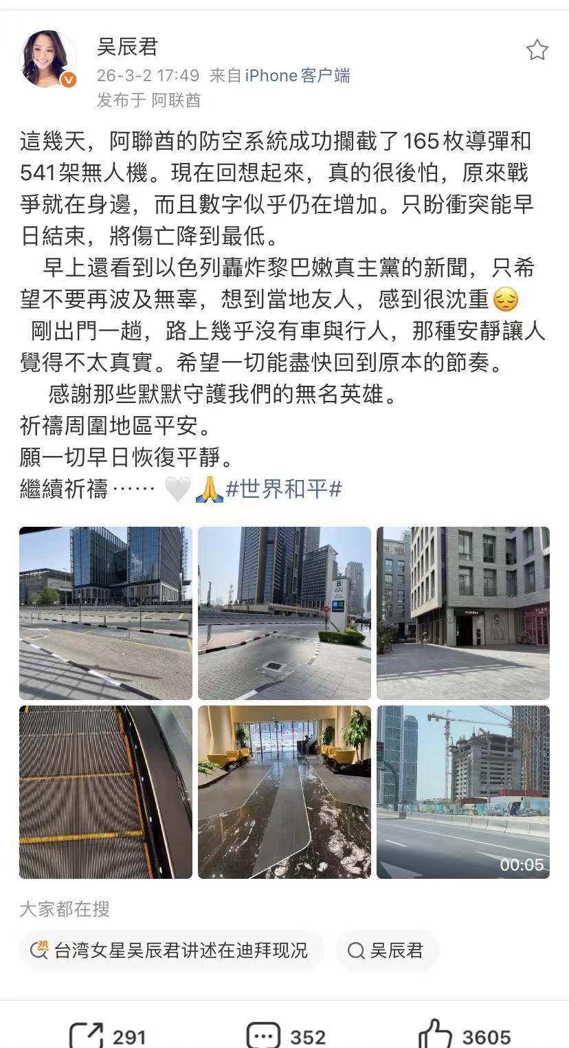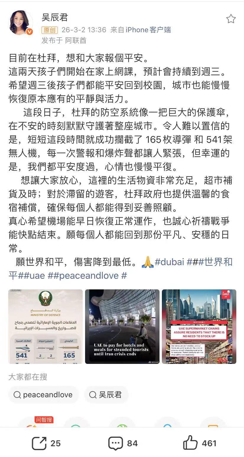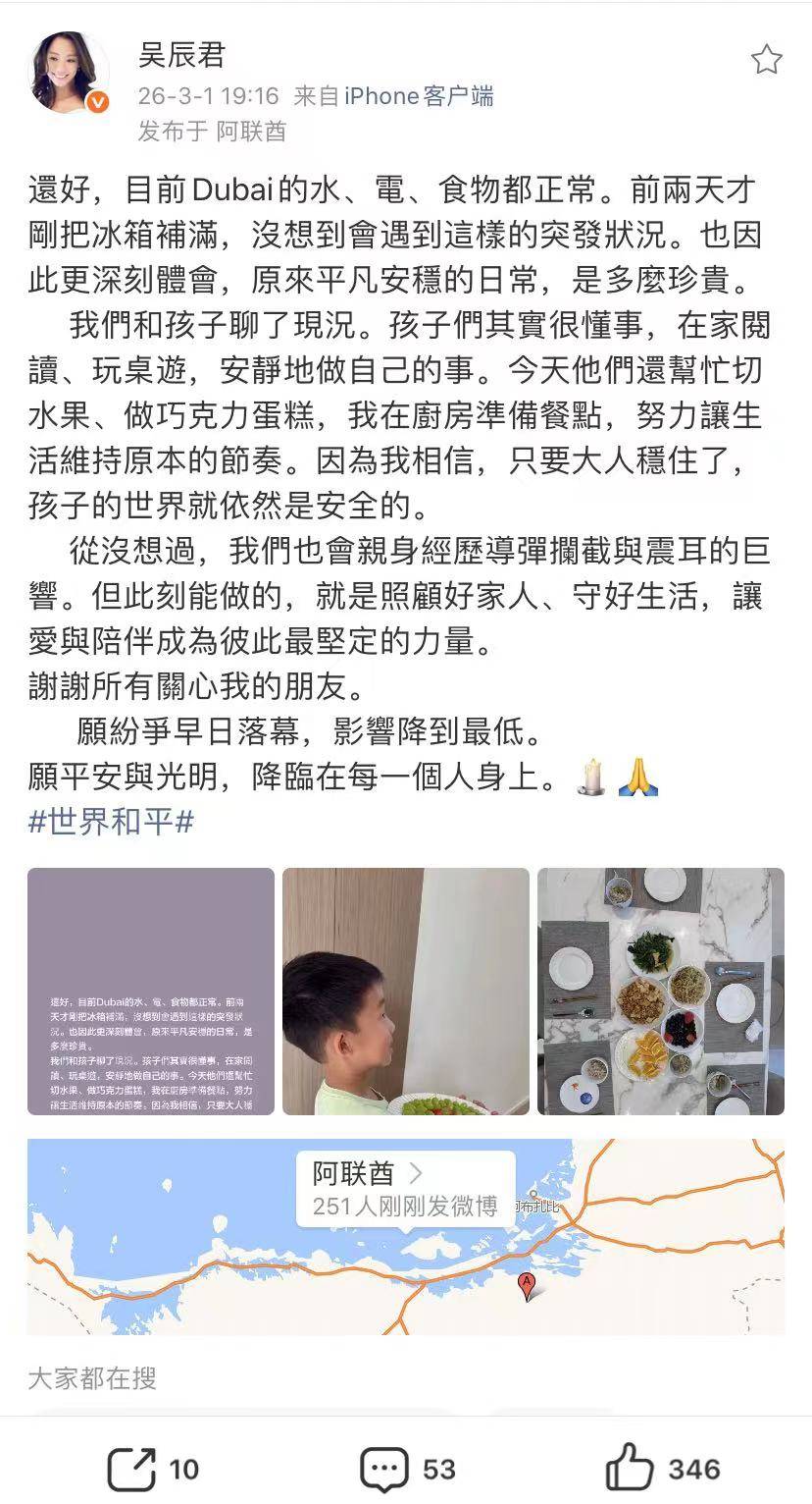 退圈女星吴辰君发文透露在迪拜生活情况。因为美以伊战争爆发,也波及到阿联酋,生活在迪拜的吴辰君,孩子上学受到影响,虽然生活供电供水正常,但孩子不能去学校上课,所以在家里阅读,