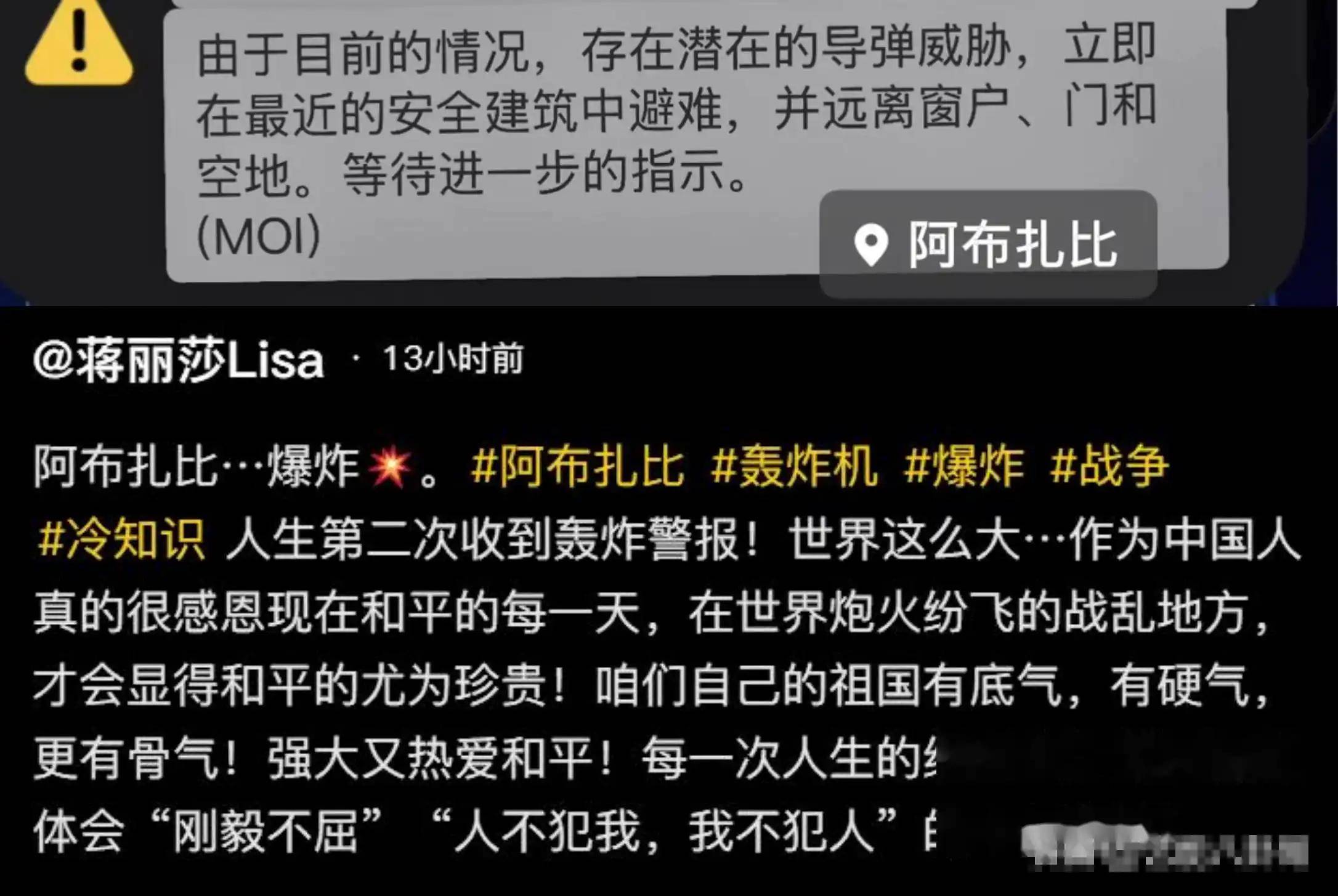 民众纷纷转发消息称,“迪拜、阿布扎比等地出现不明飞行物,疑似导弹袭击”。