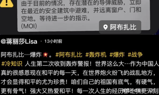 几乎在同一时间,在几百公里外的阿布扎比,陈浩民的妻子蒋丽莎在凌晨突然更新了动态。她晒出的不是度假美照,而是一条来自当地内政部的手机紧急警报截图。警报上用英文明确写着:“立即在最近的安全建筑中避难”,并要求他们远离窗户、门和空地。蒋丽莎配文说:“人生第二次收到轰炸警报!”有网友问她怎么这时候还敢出去旅游,她只能无奈回应:“来了好几天,谁能提前预料。”这句话里透出的,是一种计划被彻底打乱的无力感。