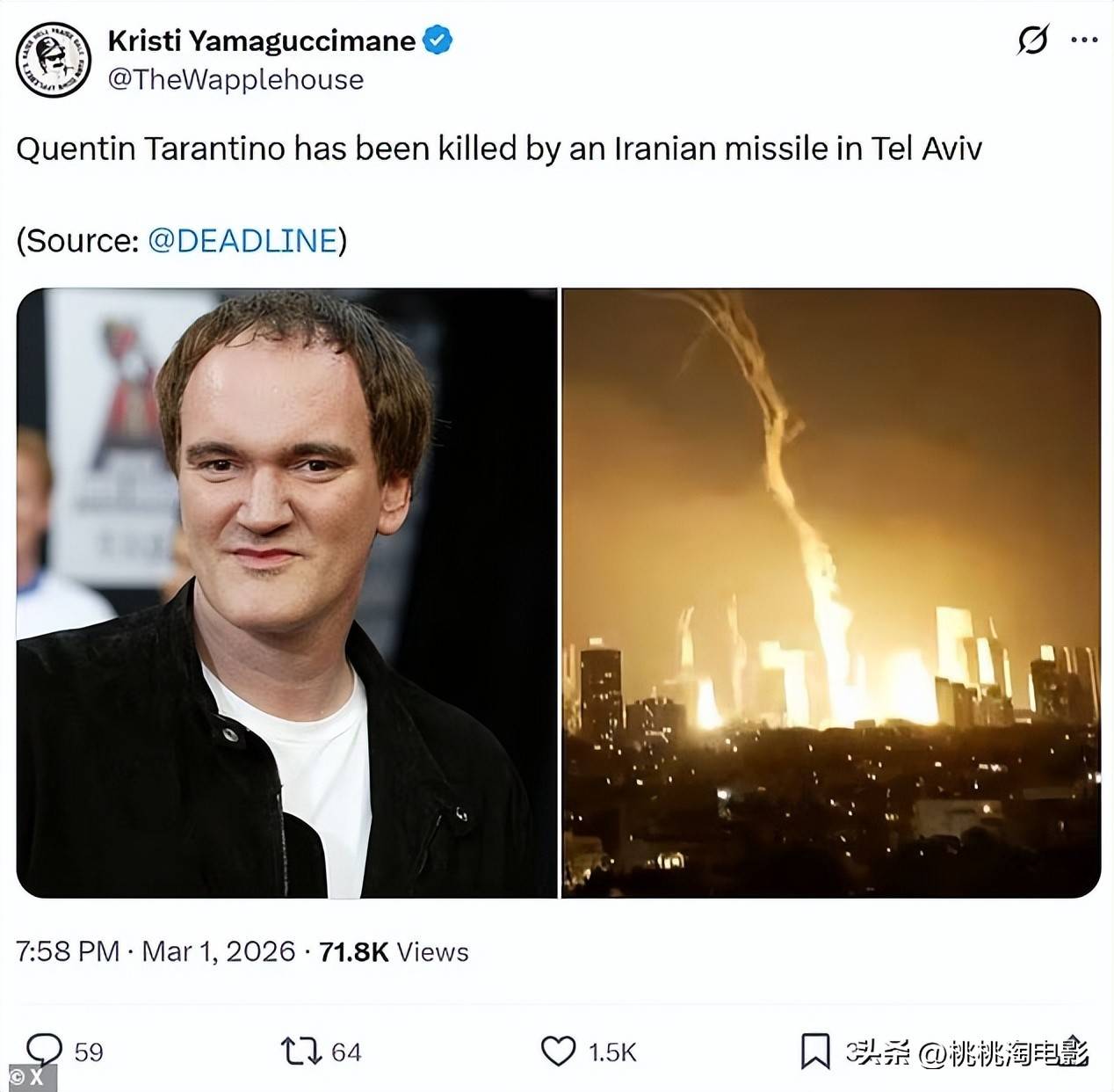 今天,有一条关于知名导演昆汀·塔伦蒂诺的消息,也是让整个好莱坞非常关注。事情的起因是,社交平台X上突然疯传一条消息,声称62岁的昆汀在伊朗对以色列特拉维夫的导弹袭击