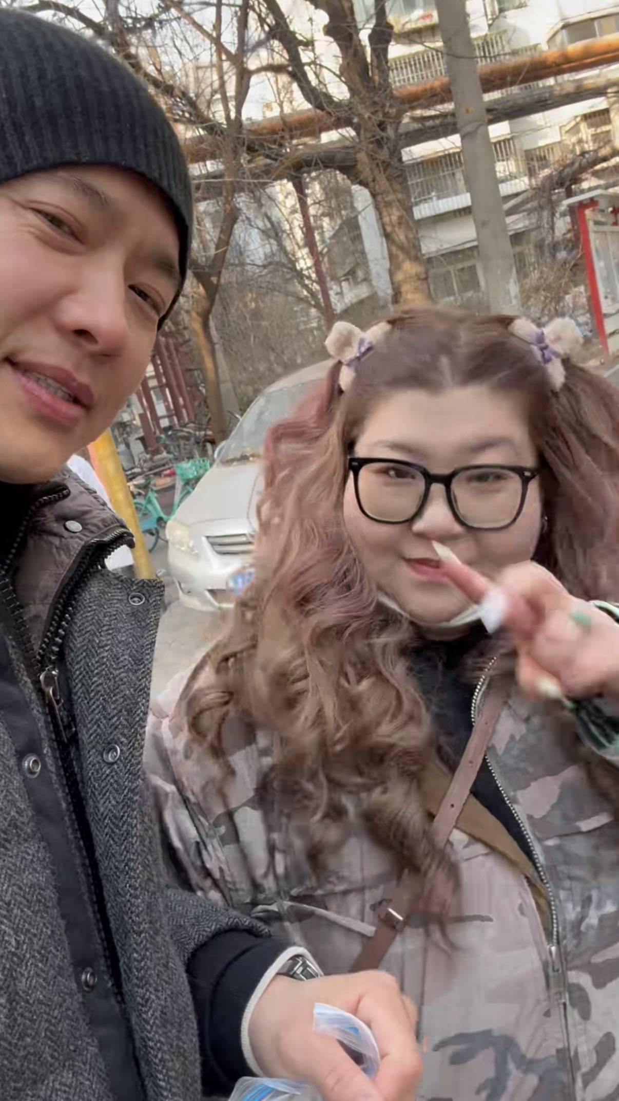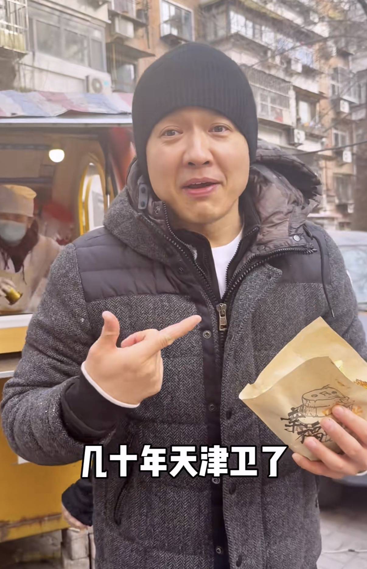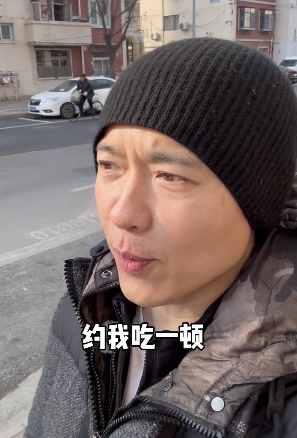 也难怪,他这么大高个,身强力壮的,如果吃太少肯定吃不饱。高云翔穿黑色连帽羽绒服,戴着针织线帽,感觉非常接地气,但还是很帅气、不油腻。