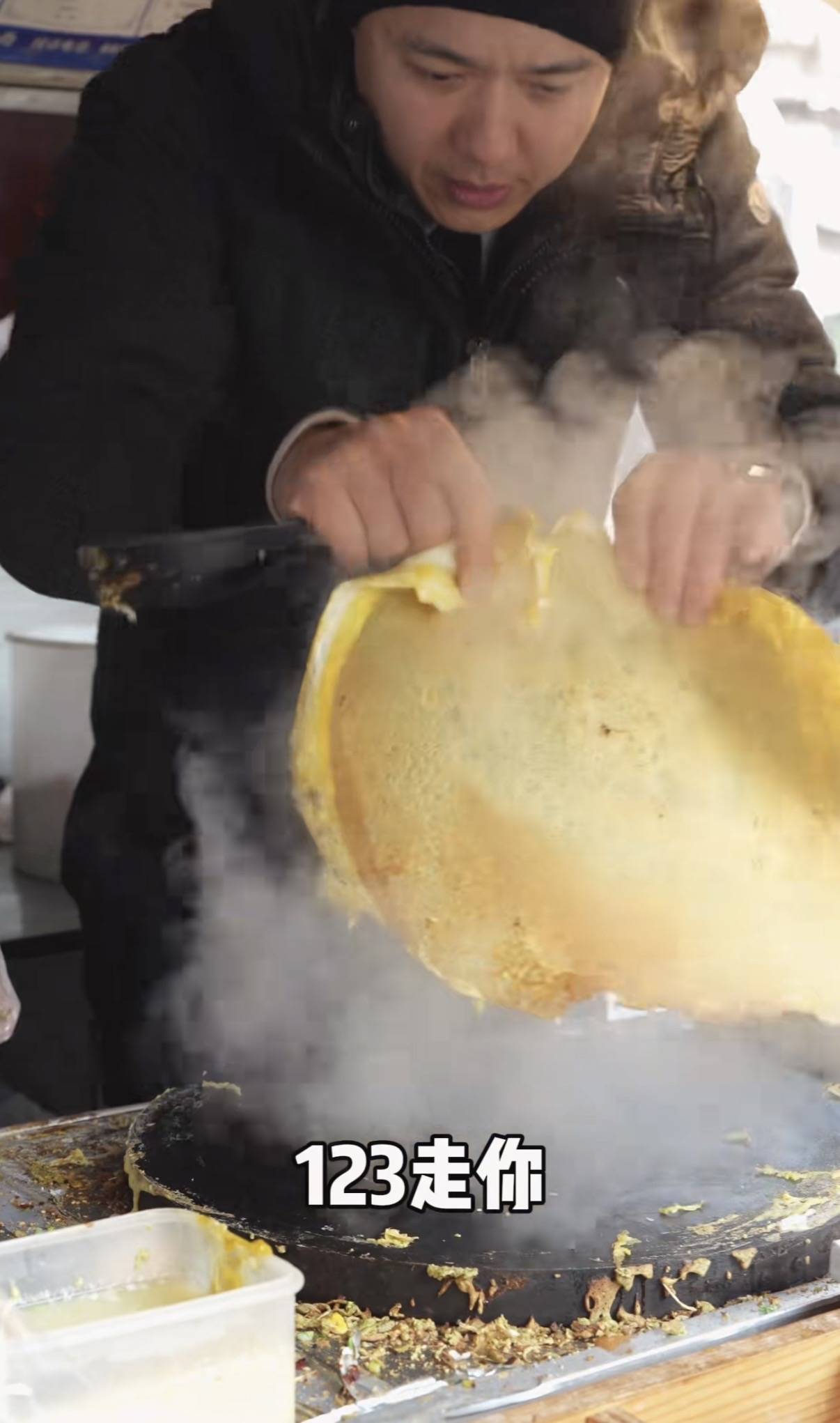 别看高云翔一个大男人,做起煎饼来还真是有模有样的。他小心地添加酱汁、芝麻、翻面,老师傅在一旁看着很欣慰。