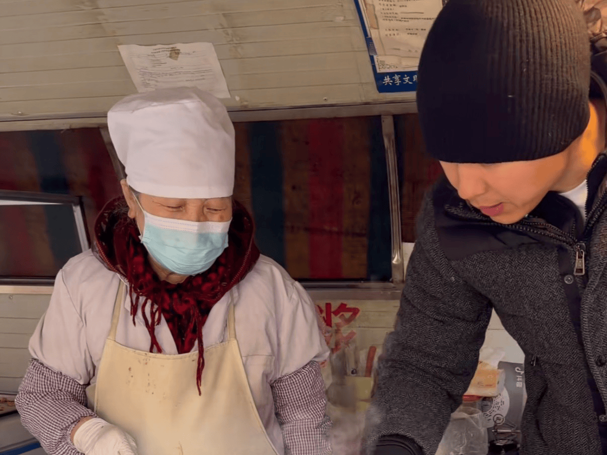 等待煎饼果子期间,高云翔还和阿姨聊天。阿姨做煎饼几十年了、已经是老师傅了。高云翔跃跃欲试,阿姨也让他尝试体验了一下自己做煎饼。