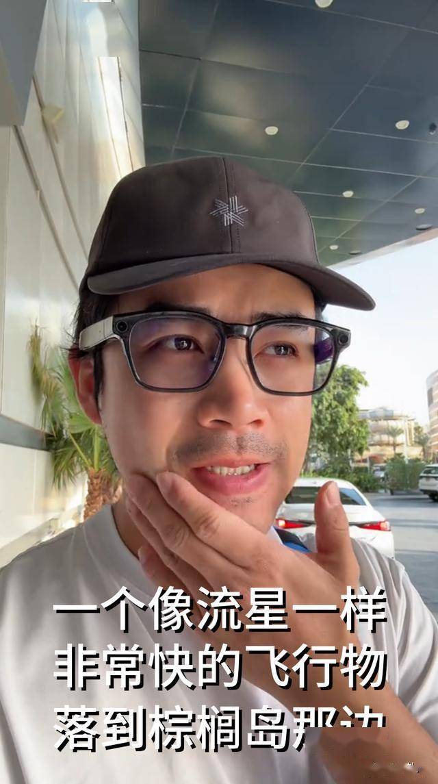 被困期间,李茂还目睹了令人惊惧的一幕:吃饭时,一颗像流星一样的高速飞行物划过天际,坠落在棕榈岛上。这一幕让他直呼“第一次在现实生活中见到”,瞬间起了鸡皮疙瘩,也让网友真切感受到当地局势的紧张。