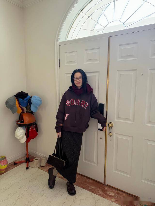 照片中,周雨彤戴着黑框眼镜,穿着休闲。一手拎包,一手扶着门把手,一副风尘仆仆刚回到家的样子。