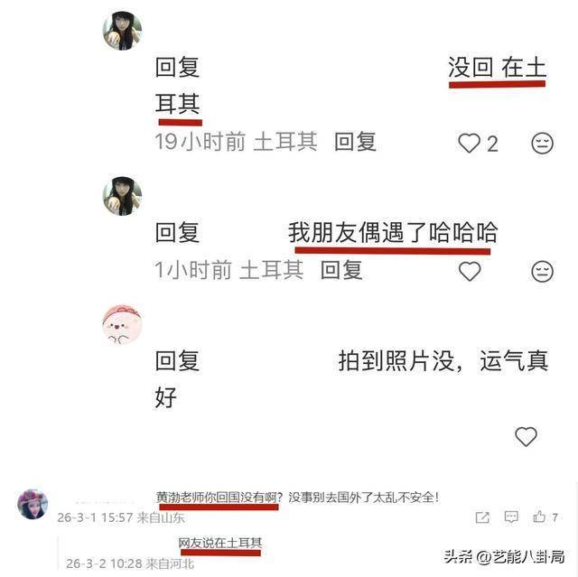 随着中东风波发酵,有网友开始追问黄渤离开迪拜后的去向,有土耳其网友留言称“没回(国)在土耳其”,称在土耳其偶遇黄渤;也有粉丝在黄渤社交账号留言询问,得到的回复也是“网友说在土耳其”。