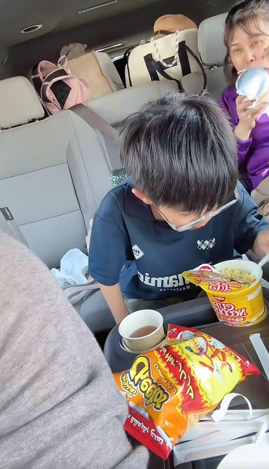 开车途中,他们给车加了油,期间还在车上吃了泡面,一家人有说有笑的,弦子还给他喂了几口。