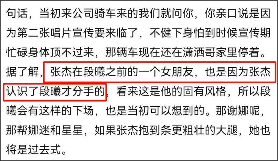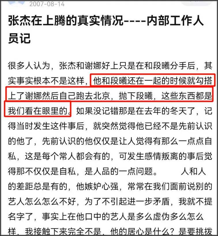 早在07年的时候,就有内部人员爆料,段曦是张杰前女友,张杰在和段曦恋爱的时候,认识谢娜,抛下了段曦,这些工作人员都看在眼里。还说在段曦之前的一任女友,也是这么分手的。