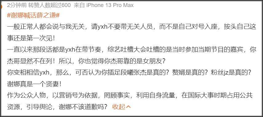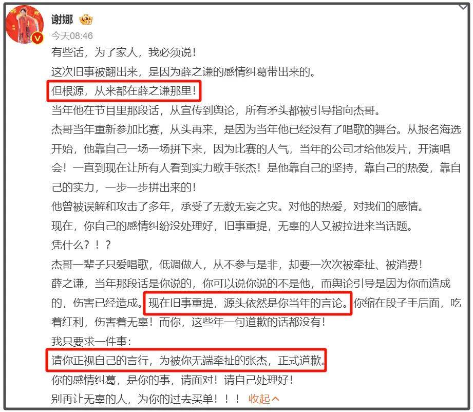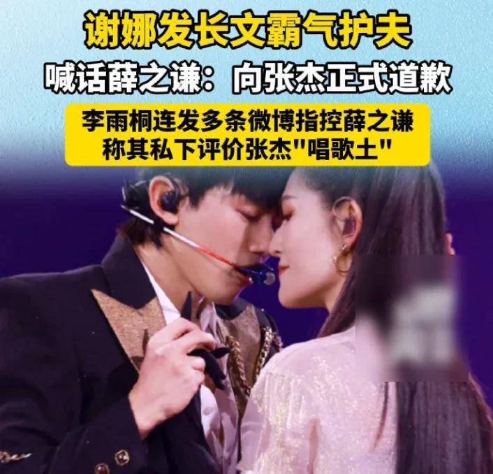 谢娜因为李雨桐爆料薛之谦曾说张杰土一事,直接发长文喊话薛之谦道歉,称有关张杰旧事的误解和攻击,根源从来都在薛之谦那里。