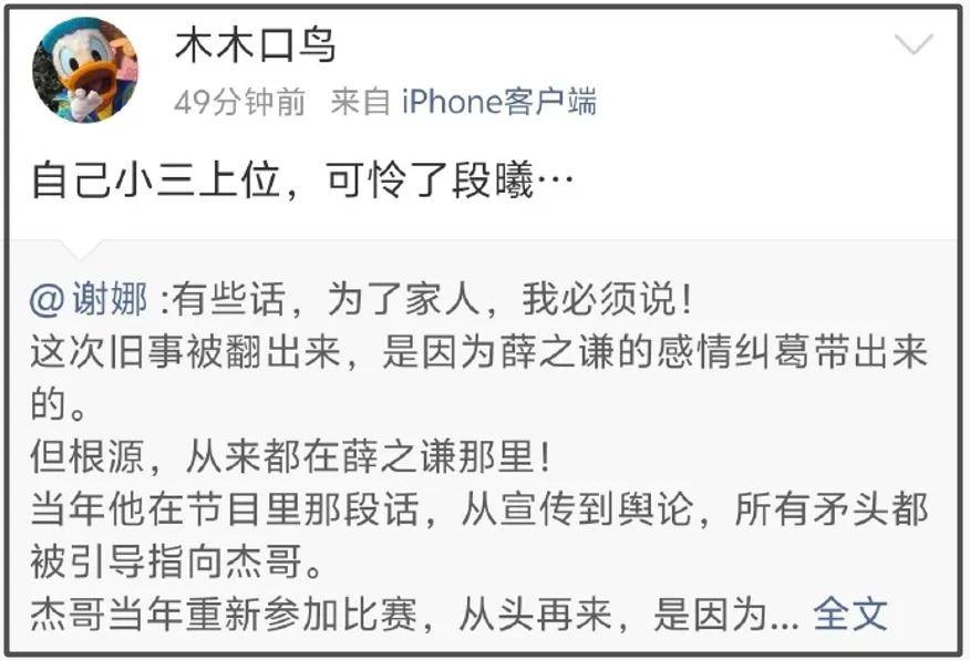 但疑似薛之谦的朋友看不下去了,直接转发谢娜的文章,并开启反击模式,嘲讽谢娜:“自己小三上位,可怜了段曦… ”