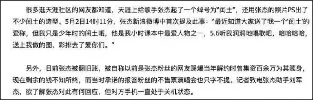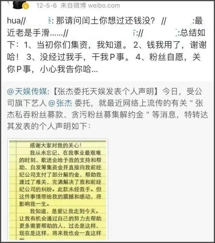 这件事在当年也有报道,甚至传出剩余款项不明一事。后续张杰还委托天娱发声明回应,承认是歌迷帮助他渡过难关,他很感动,但具体款项没有经过他的手,是否会还款也没有提及,不过粉丝表示张杰有开免费演唱会。