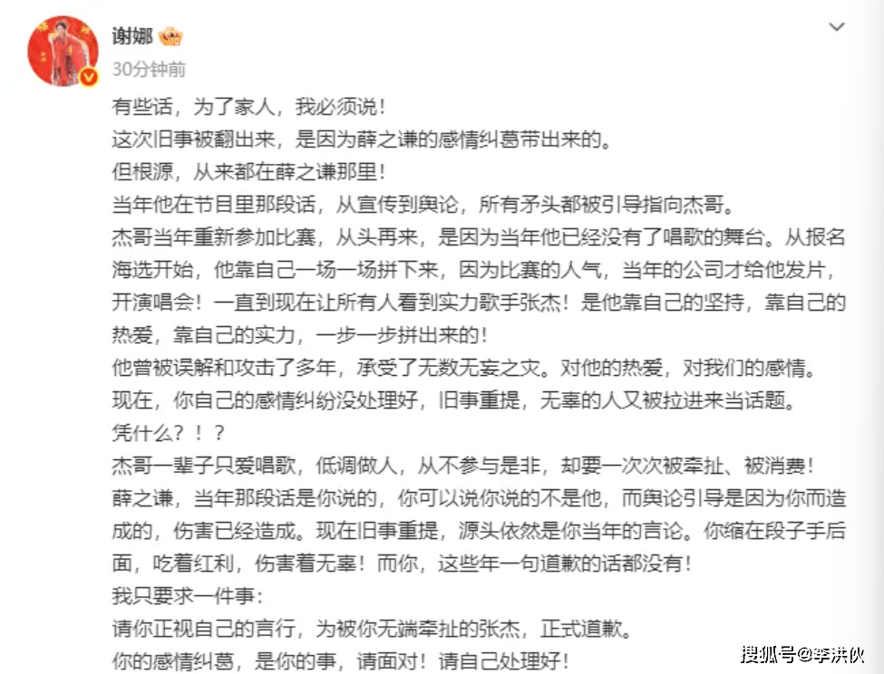 所以,如今谢娜也直接发文喊话薛之谦,让他向张杰道歉!